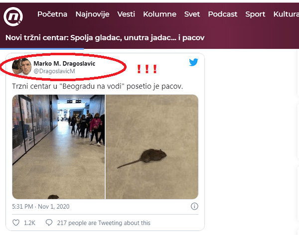 Ђиласови медији (Н1, Данас, Нова, Директно…) годинама намерно шире и велике и мале лажи. Када је у питању епидемија, те лажи и лажне вести остављају велике последице. Ево примера једне „мале“ лажи. Ђиласови медији Н1, Нова и Директно, објавили су лажну вест да су се у новом тржном центру „Галерија“ појавили пацови. Да су у питању професионални медији, они би проверили свој извор ове смешне неистине. Не да нису проверили извор, већ су намерно објавили лажну вест. Извор те вести је Твитер профил и фотомонтажа извесног Марка Драгославића, функционера Јеремићеве Народне странке, иначе беспосличара и насилника који се лажно представља као „слободни новинар“. Драгославић је државним органима познат као лице које је 31.10.2017. физички напало директора Клиничко болничког центра Звездара, Петра Сворцана. Тада је КБЦ саопштио:„КБЦ Звездара саопштава да је директор КБЦ Петар Сворцан, претучен у петак око 14 часова на раскрсници у близини болнице. Директора КБЦ Звездара је напао Марко Драгославић, против кога смо више пута подносили пријаве због неовлашћеног сликања унутар болнице и узнемиравања“. КБЦ Звездара је више пута пријављивао Марка Драгославића полицији, због тога што се константно и неовлашћено „шуњао“ по просторијама ове болнице и узнемиравао лекаре и пацијенте, те неовлашћено фотографисао и снимао, лекаре, пацијенте, и унутрашњост болнице, кршећи све болничке протоколе. Драгославић је органима гоњења постао познат и 08.05.2019. када је током блокаде радова на реконструкцији Трга Републике коју су спроводили Ђиласови и Јеремићеви хулигани, предвођени бившим председником општине Стари Град Марком Бастаћем, дошло до инцидента током којег је насилник Драгославић малтретирао и псовао старијег Београђанина, пензионера Страхињу Р. (68).
