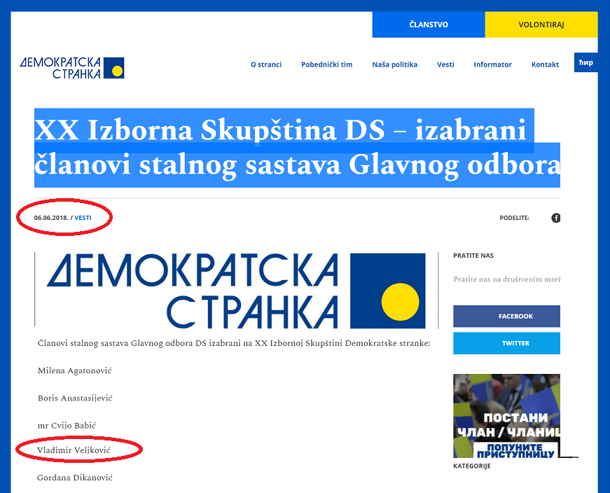 Владимир Вељковић је и ђиласовац и другосрбијанац. Он пише за „Пешчаник“ и за „Јужне вести“. Он је функционер Лутовчеве ДС, из Ниша. Члан је Главног одбора ДС (од 2018.) и потпредседник Општинског одбора ДС – Медијана, Ниш.
