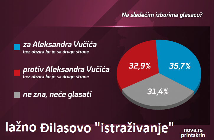 Део ових Ђиласових халуцинација представља и лажно истраживање јавног мњења које је објављено на Ђиласовом и Шолаковом порталу „Нова С“ и на другим њиховим медијима 13.01.2021. Хумористички наслов на порталу „Нова С“ гласи: „Истраживање: За Вучића 35,7%, против њега 32,9%“. У тексту стоји: „На следећим изборима за Александра Вучића, без обзира ко је са друге стране, гласаће 35,7 одсто грађана, против њега је 32,9 одсто бирача, док 31,4 одсто гласача не зна како ће се определити или неће изаћи на изборе, показало је истраживање јавног мњења које је поручила Странка слободе и правде Драгана Ђиласа. Лидер ССП Драган Ђилас (…) је порталу Нова.рс проследио истраживање чији је наручилац његова странка. Ђилас није желео да нам открије име агенције која га је урадила уз наводе да би због лоших резултата по Вучића могла да трпи консеквенце. Ово истраживање је рађено у децембру, на узорку од 1.200 људи. На питање да су избори у недељу за кога би гласали, за СНС – Александар Вучић определило би се 40,2 одсто бирача, а СПС би освојио 6,8 одсто гласова. За СПАС Александра Шапића определило би се 3,7 одсто грађана, док би за опозиционе странке и покрете (ССП, ДС, ДЈБ, Двери, НС, ПСГ, ЗЗС, НДБГ, СДС) гласало 26,4 одсто бирача. Према том истраживању – СРС, ПОКС, Заветници и ДСС добили би укупно четири одсто гласова, мањине 3,5 одсто, а 15,4 процената определило би се за опозицију, али не знају тачно за кога“.