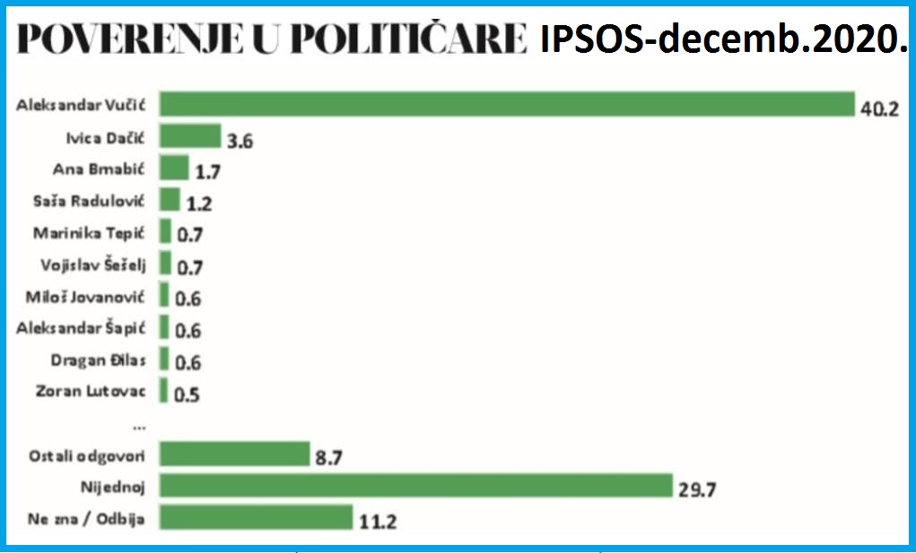 Уз то истраживање „Ипсоса“ говори о поверењу грађана у поједине политичке личности и по том истраживању 40,2 одсто грађана Србије има апсолутно поверење у Александра Вучића. Први следећи за њим је Ивица Дачић са 3,6 одсто, а затим следи Ана Брнабић са 1,7 одсто. За премијерком следи низ од седам политичара, од којих сваки има око један одсто: Саша Радуловић 1,2, Мариника Тепић 0,7, Војислав Шешељ 0,7, Милош Јовановић 0,6, Александар Шапић 0,6, Драган Ђилас 0,6, Зоран Лутовац 0,5. Сви остали политичари у збиру имају 8,7 одсто, при чему ниједан од њих није прешао 0,5 одсто. Ако се ови проценти претворе у апсолутне бројке, уз хипотезу да имамо пет милиона и двеста хиљада пунолетних бирача присутних у Србији, нешто мало мање од 2,1 милион грађана Србије наводи Александра Вучића као политичара ком највише верује, Ивицу Дачића око 190.000, Сашу Радуловића нешто преко 60.000 и Драгана Ђиласа нешто мало преко 30.000 – рекао је директор „Ипсос – Стратеџик маркетинга“ Марко Уљаревић 01.01.2021. И све то је сурова стварност по Драгана Ђиласа. Његова странка има подршку 1,6 одсто грађана, а Вучићев СНС има 60,6 одсто. Александру Вучићу апсолутно верује 40 одсто грађана (2.100.000), а Ђиласу 0,6 одсто (30.000). А онда је Ђилас својим хокус покус истраживањем готово изједначио 1,6 одсто и 60,6 одсто и изједначио је 40 одсто и 0,6 одсто. Да није трагично, било би урнебесно смешно.