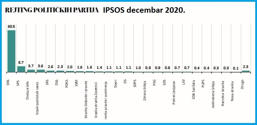 Да је цела ова Ђиласова и Вукадиновићева ујдурма, чиста лаж и измишљотина, доказује децембарско истраживање реномиране агенције „Ипсос- Стратеџик маркетинг“ које каже да би СНС би освојио 60,5 одсто или око 2,1 милион гласова, СПС 8,7 одсто, Доста је било 3,7 одсто, Спас Александра Шапића 3,6 одсто, а поред њих, у зони преласка цензуса су и СРС, ДСС и ПОКС. Од осталих опозиционих странака ниједна самостално не прелази преко два одсто.