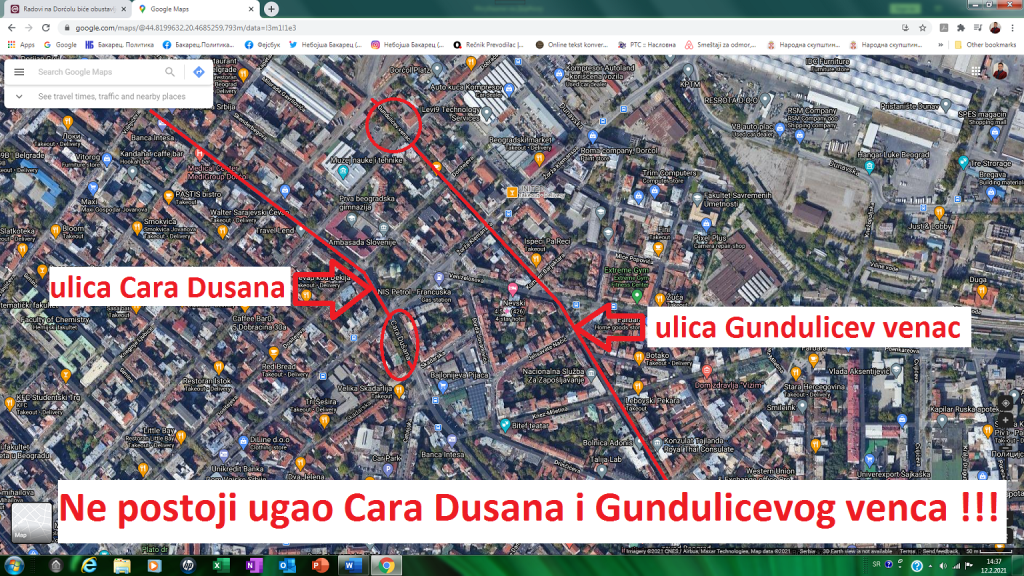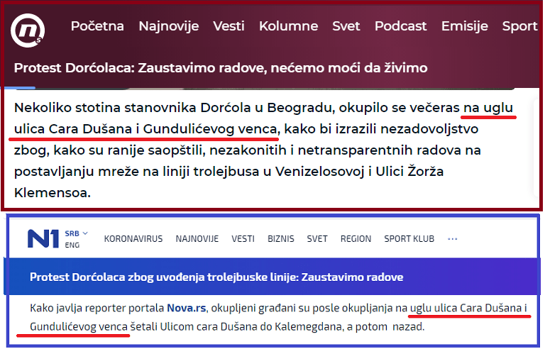 Тако су сви Ђиласови медији (ТВ Н1, ТВ НОВА С, Данас, портали Н1, Нова С, Директно, НСПМ итд.) 11.02.2021. известили да је одржан протест на Дорћолу због наставка радова на увођењу тролејбуске мреже. Приказали су и снимак стотинак грађана. Овом приликом указаћу на то да ни ови медији, нити протестанти не знају где ударају, не знају где се налазе. Окупљени с коца и конопца, шака јада, са све Ђиласовим новинарима, објавила је да су се окупили „НА УГЛУ УЛИЦА ЦАРА ДУШАНА И ГУНДУЛИЋЕВОГ ВЕНЦА“ !?! Урнебесно!!! То су јавили сви Ђиласови медији – ТВ Н1, ТВ НОВА С, Данас, портали Н1, Нова С, Директно, НСПМ итд. Нико од стотина новинара тих „елитних“ медија, нико од стотинак протестаната, не зна, нема појма да НЕ ПОСТОЈИ УГАО УЛИЦА ЦАРА ДУШАНА И ГУНДУЛИЋЕВОГ ВЕНЦА!!! Те две улице су паралелне једна другој и раздваја их два блока улица!!!