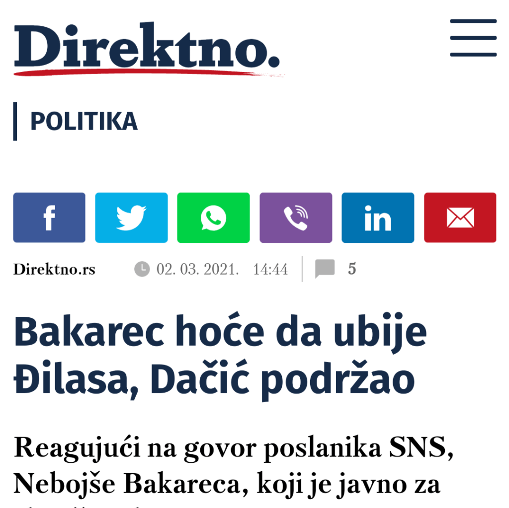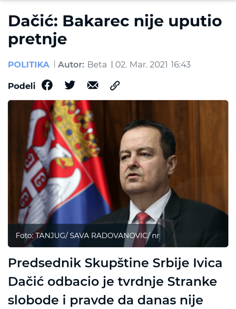 Уз ову вест овај сајт мржње је објавио и вест „Бакарец хоће да убије Ђиласа, Дачић подржао“. Ова лажна вест се наслања на претходну лажну вест „Бакарец: Нашу опозицију треба ликвидирати, као ону у Русији“, иако су те две лажне вести контрадикторне. Потпуно је апсурдно да овај медиј у своје лажи увлачи господина Дачића. То су образложили тиме што ме није опоменуо. Није ме опоменуо због тога што нисам чак ни индиректно претио било коме, а камоли позвао на било чију ликвидацију. У сваком случају захваљујем се г. Дачићу због тога што је после паузе, одговорио на лажне вести које шире ђиласовски медији.