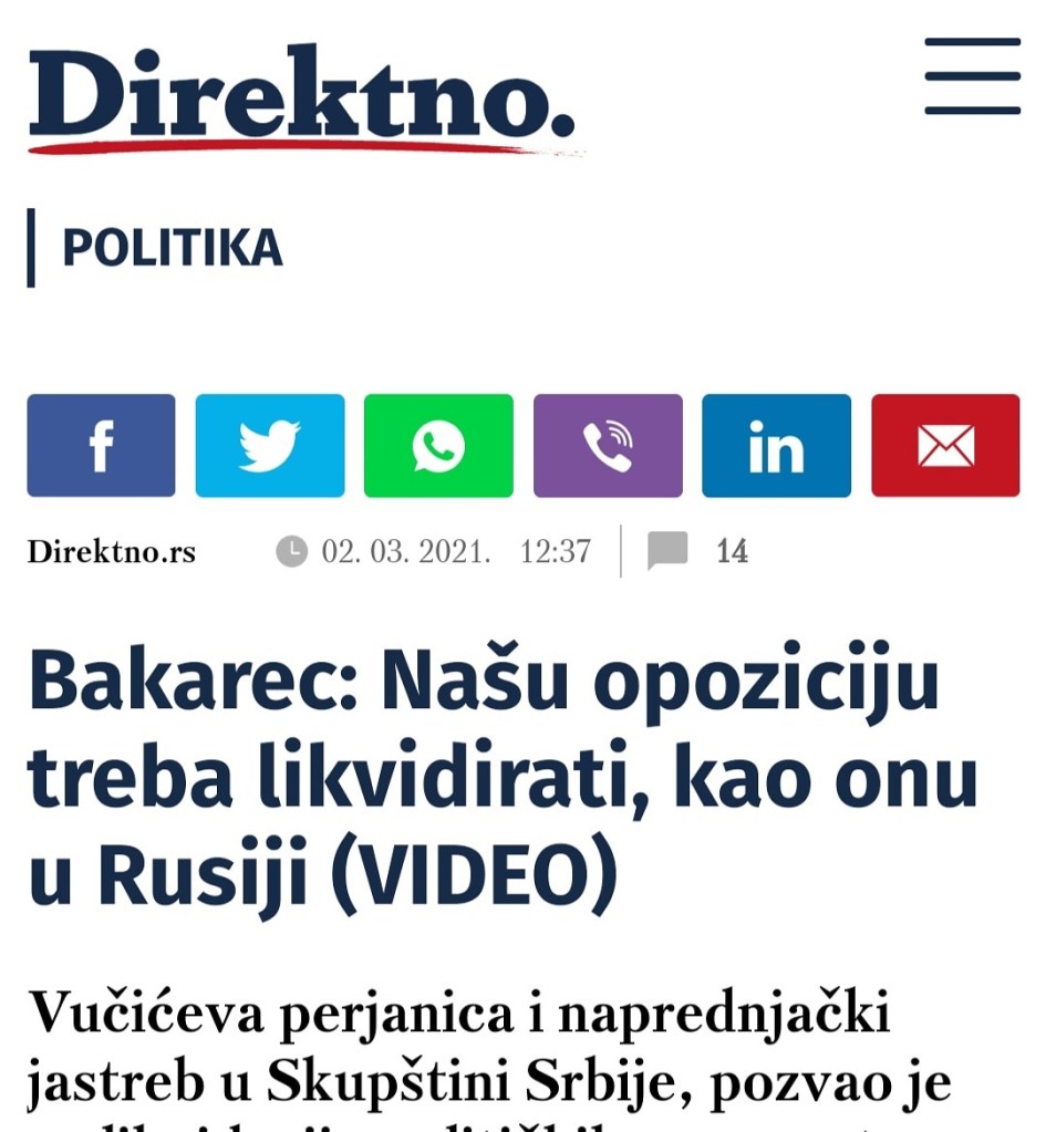 Сајт „Директно“ је контрадикторан и сајту Н1 и сајту Нова С. Међутим, овај Ђиласов сајт је контрадикторан и у односу на саопштење партије свог шефа ССП. Сајт „Директно“ је објавио следећу лажну вест „Бакарец: Нашу опозицију треба ликвидирати, као ону у Русији“. Ова вест је наравно неистинита, и заснована је на подметању и лажи. Нисам рекао ни једну једину реч из наслова сајта Ни један нормалан новинар из реченице „Знате како се то решава у Русији? Тако што те нема“ не би могао извући закључак да се ради о позиву на ликвидацију опозиције. Друго, ова вест је сасвим супротна саопштењу Ђиласове странке, која тврди да је ова реченица позив на убиство Ђиласа, а не целе оппозиције. Дајте људи, из исте сте странке, договорите се шта хоћете, делујте усаглашено, кад већ лажете.