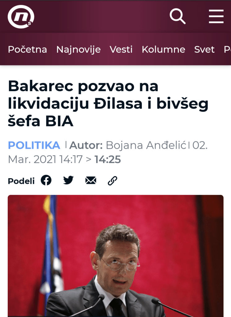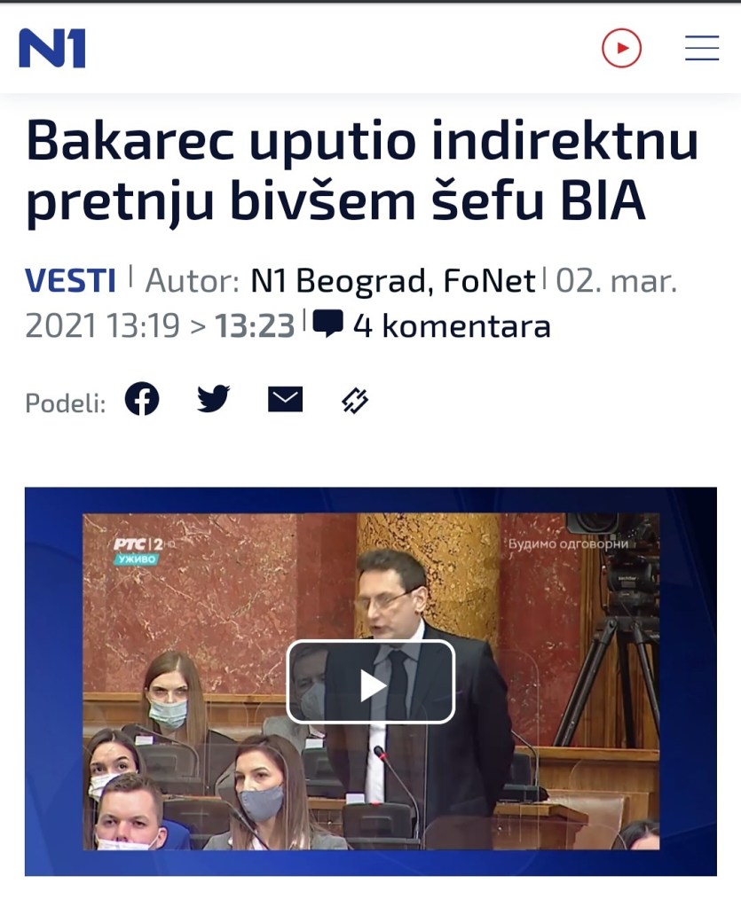 Сајт ТВ Н1 је поступио делимично професионално. Објавили су вест под насловом „Бакарец упутио индиректну претњу бившем шефу БИА“. То су закључили на основу реченица „Шта је ковање завере, ако то није тајни састанак тајкуна и шефа ССП, Драгана Ђиласа у Трсту, са бившим шефом БИА Вукадиновићем, политичким директором ССП Вуком Вучуревићем, и Јадранком Дринић? То што је урадио бивши шеф БИА је недопустиво у професионалном погледу. Замислите да се бивши шеф ФСБа састане са Наваљним? Знате како се то решава у Русији? Тако што те нема“. Као што видите, нема чак ни индиректне претње било коме, већ износим своје мишљење о томе како се неко питање решава у Русији. Нисам изнео ни вредносни суд о томе да ли је тај начин добар или није. Новинарска слобода може натегнути моју изјаву и пристрасно је приказати као индиректну претњу, али ништа више од тога. Сама вест Н1 демантује став Ђиласовог ССП, који преносе у другом делу вести, где стоји комичан став Ђиласове странке која каже да сам позвао на ликвидацију Саше Вукадиновића, Вука Вучуревића и Драгана Ђиласа. Да сам позвао на ликвидацију те тројице, онда би то и Н1 констатовао. Индиректна претња је сасвим супротна директном позиву на ликвидацију.