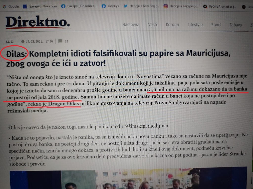 Драган Ђилас је 12.03.2021. на КЗШ-у више пута изјавио да нема рачуне, нити фирму на Маурицијусу. Драган Ђилас је све то поновио 15.03.2021. и 18.03.2021. на још две КЗШ, у седишту своје странке. Све што је лидер ССП Драган Ђилас претходних дана лагао о својим рачунима у иностранству – пало је у воду. Докази до којих су дошле „Новости“ потврђују да се његово пословање протеже све до пореског раја Маурицијуса, као и да има позамашне суме на тајним рачунима у низу држава! У свом покушају да негира очигледне доказе о својим рачунима на Маурицијусу, Ђилас је притешњен доказима сада почео да износи очајничке неистине о фалсификатима, мутећи бистру воду доказа о банци на Маурицијусу у којој има 5,7 милиона евра. Да видимо да ли је Ђилас и иначе склон неистинама? Подсетићу Вас само на очигледне неистине које је изнео ове године. Биће вам јасно да и сада говори неистину. Прво је у јануару лансирао неистину, 7 месеци после избора, да је у гласачке кутије убачено најмање 200.000 гласова. Друго, у јануару је испалио неистину да се из Србије дневно исели 50.000 људи тј. 18 милиона годишње!?! Треће, слагао је да је његова слика са криминалцем Владом Јапанцем, настала случајно. Сада износи неистине да нема рачун на Маурицијусу, нити било где у иностранству. При томе Ђилас више пута јавно вређа и понижава новинаре који само раде свој посао, етикетира их и онемогућава у вршењу свог посла. Истовремено избегава да одговори на било које питање у вези својих тајних рачуна. Тако тајкун Ђилас показује своју тоталитарну природу. Да ли ће реаговати ЕУ и Тања Фајон? Неће! Двоструки стандарди.