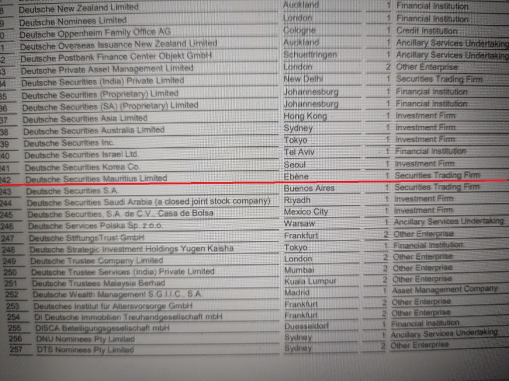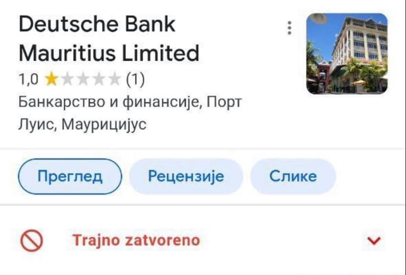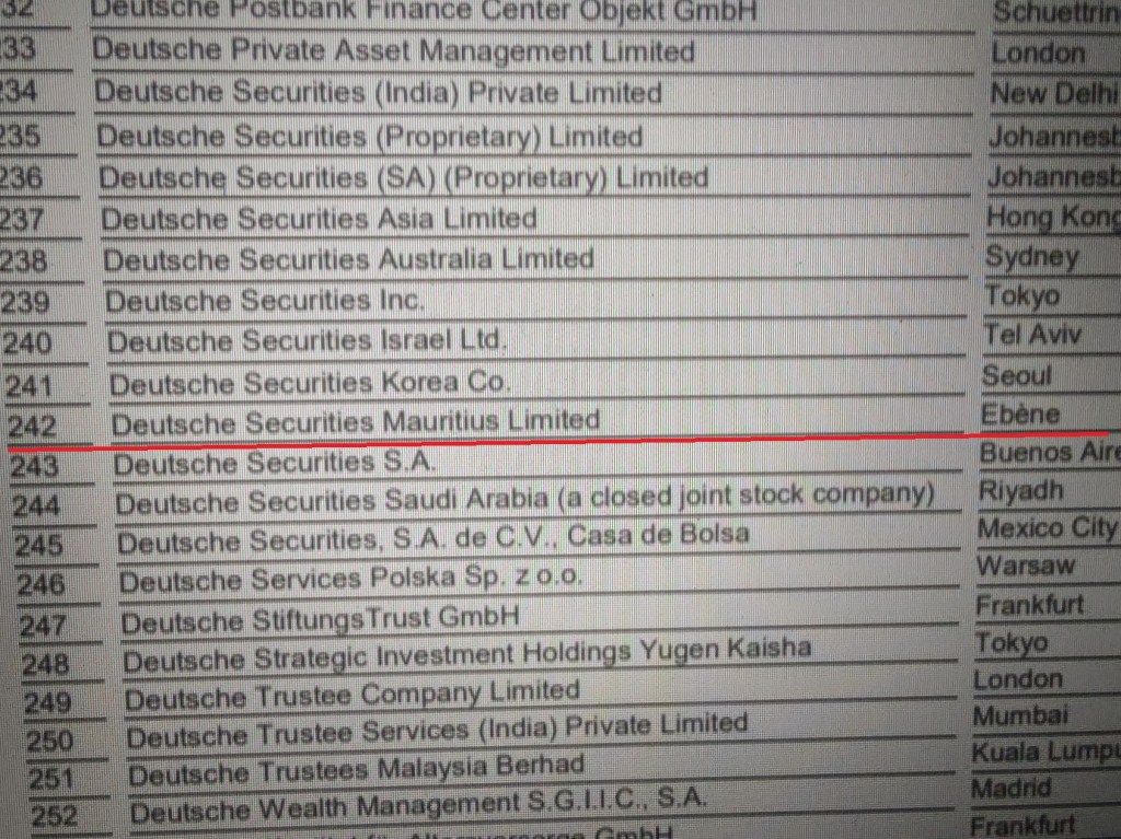 Линкови ка сајту „Дојче банке“, и ка претраживачу који показује податке о офшор фонду, пословном офшор ентитету са Маурицијуса – „Дојче Секјуритиз Маурицијус Лимитид“ („Deutsche Securities Mauritius Limited“) у коме Ђилас има 5,7 милиона евра. Власник и оснивач „Дојче Секјуритиз Маурицијус Лимитид“ (Deutsche Securities Mauritius Limited)“ је „Дојче банка“!