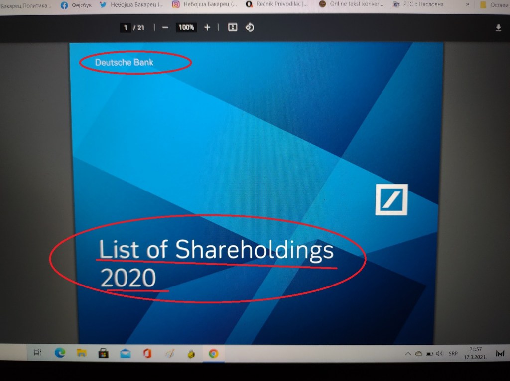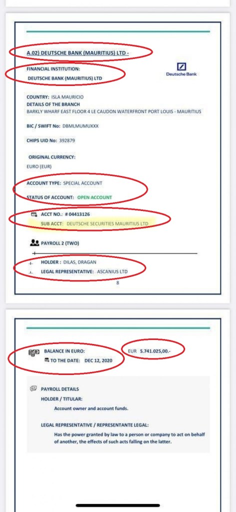 Да Ђилас говори неистину потврђује једноставна претрага интернета од 5 минута. Извршио сам претрагу последњег годишњег извештаја „Дојче банке“ за 2020., који се налази на интернету. У делу Извештаја „Дојче банке“, „List of shareholders“- subsidiaries (подружнице), где у делу о ћеркама фирмама и подружницама, видимо да „Дојче банка“ на Маурицијусу има активан пословни офшор ентитет – фонд, – „Дојче Секјуритиз Маурицијус Лимитид“ („Deutsche Securities Mauritius Limited“) у коме Ђилас има рачун са 5,7 милиона евра. Да поновим, власник и оснивач „Дојче Секјуритиз Маурицијус Лимитид“ је „Дојче банка“! У извештају „Дојче банке“ тај пословни офшор ентитет на Маурицијусу, се налази под бројем 242, има седиште у главном граду Маурицијуса, Порт Луију, у предграђу Ебене. Даљом претрагом података тог офшор пословног ентитета, види се да је он активан, да је у власништву „Дојче банке“, и да је означен као офшор фирма која пружа услуге које иначе пружају пословни ентитети у офшор рајевима. О томе сведоче скриншотови докумената Дојче банке, и њеног деоничара-акционара са Маурицијуса. Ђилас је сакривен иза параван компаније „Асканијус Лтд“, али је коначни власник и управљач рачуна баш он, Драган Ђилас, како и стоји у коначном изводу тог рачуна, од 12.12.2020. О томе сведоче и линкови које прилажем на крају текста.