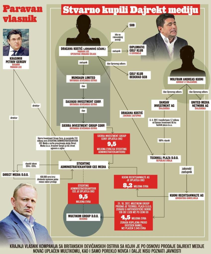 Документи „Конкуренцијског вијећа Босне и Херцеговине“ од 08.08 2018. године, показују да постоје две компаније „Дајрект Медија“, то: „United Media S.à.r.l., 16-18, rue du Strasbourg, L – 2560 Luksemburg, Veliko Vojvodstvo Luksemburg“ и „Direct Media d.o.o. Antifašističke borbe 13b, 11000 Beograd, R. Srbija, Media Point d.o.o., Antifašističke borbe 13b, 11000 Beograd, R. Srbija“. Из ових и претходно наведених многобројних параван компанија види се сложена шибицарска шема прикривања (где је куглица?).