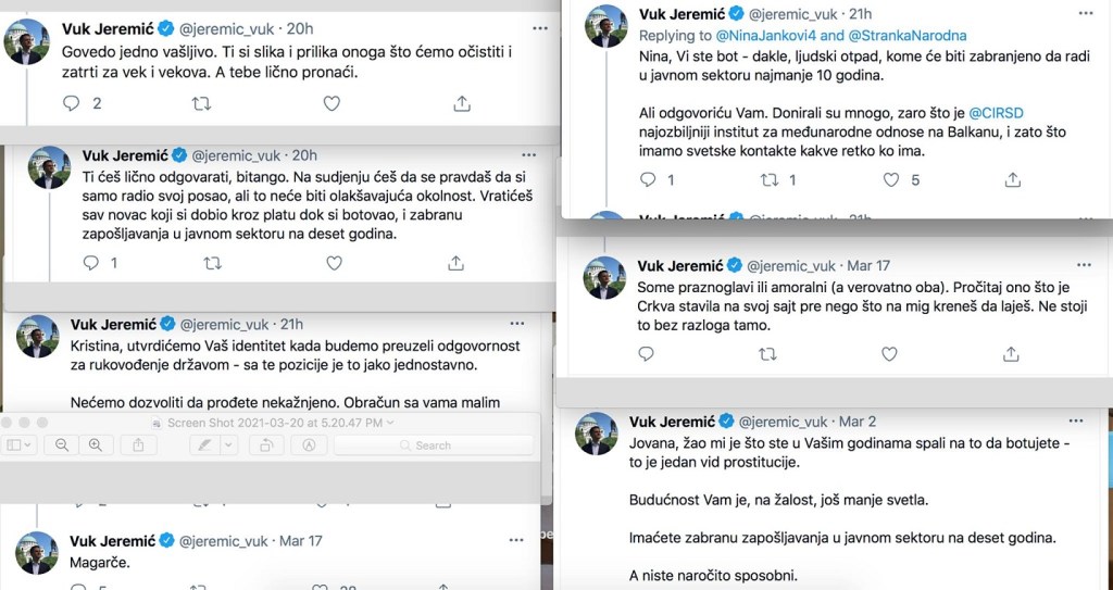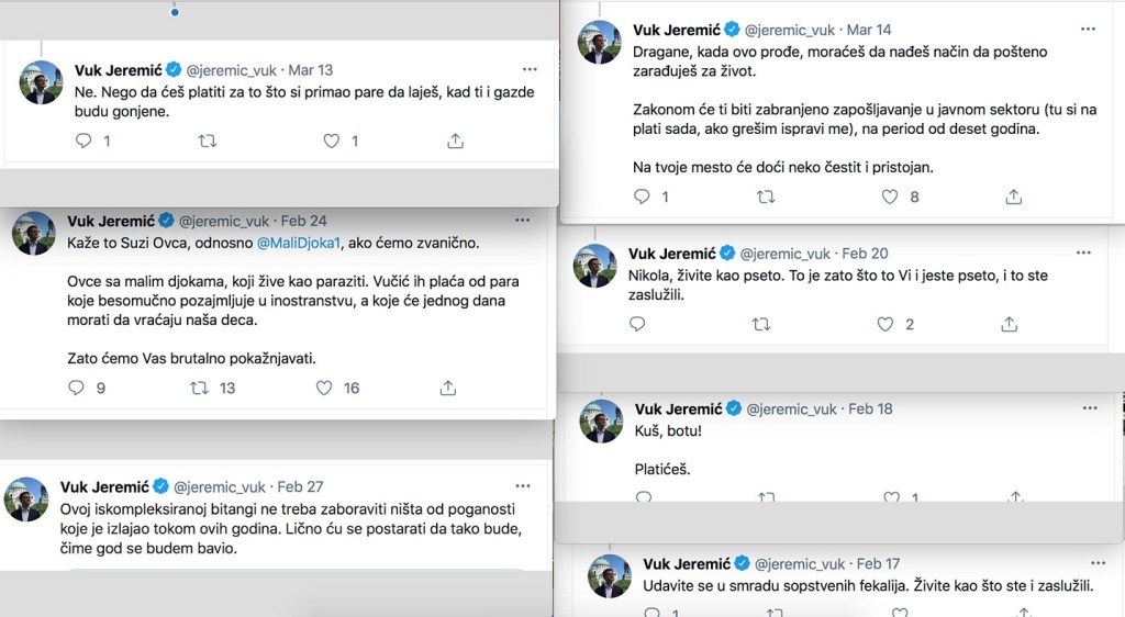 И сада долазимо до тога да је велика мука Јеремије Вука – на Твитеру. Твитер мука. Долазимо до питања чему то Јеремијино образовање? Чему Кембриџ, чему Харвард? Да би у четреспетој псовао и претио по Твитеру и вређао жене! Све ти „бисери“ су из ове 2021. године! „Бисери“ Јеремије Вука Бранковића обухватају значајне литерарне узлете – вероватно је то учио на Кембриџу и на Харварду.