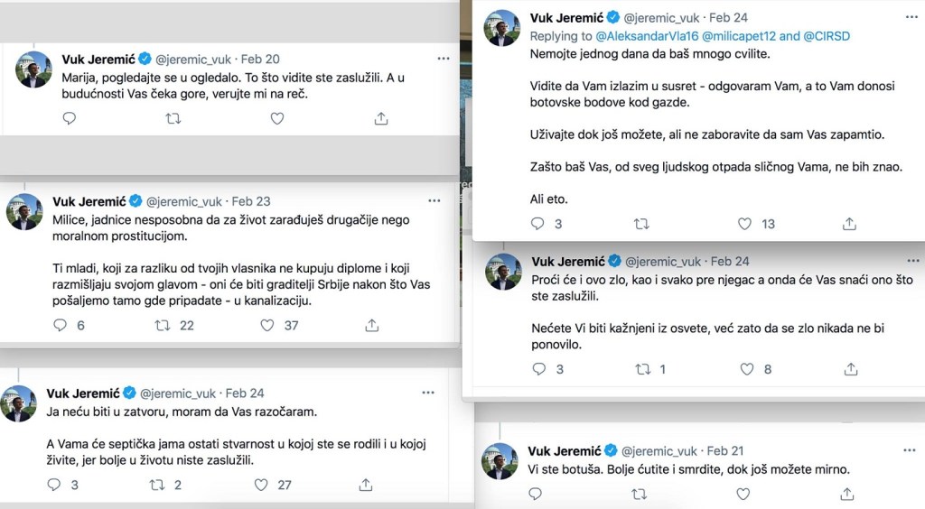 Јеремија Вук, супруг и отац каже: „Милице, јаднице неспособна да за живот зарађујеш другачије него моралном проституцијом…након што Вас пошаљемо – у канализацију“ “- 24. фебруар.