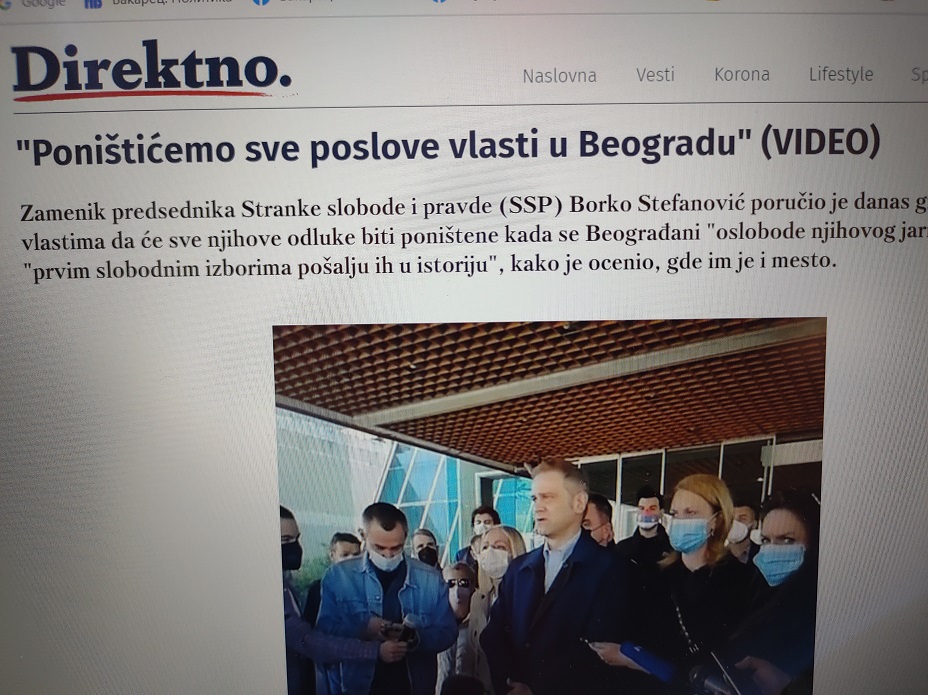 На страну и то. Сви медији „човека без савести“ су јавили да је „човек без имена“ (Стефановић Б) на конференцији за штампу, припретио следеће:“Поништићемо све послове власти у Београду. Све одлуке које данас доносите и које сте доносили претходних дана биће анулиране и решене оног момента кад се Београд ослободи вашег јарма и када вас на првим слободним изборима Београђани јединствено пошаљу у прошлост“. Ово се односи и на целу Србију.