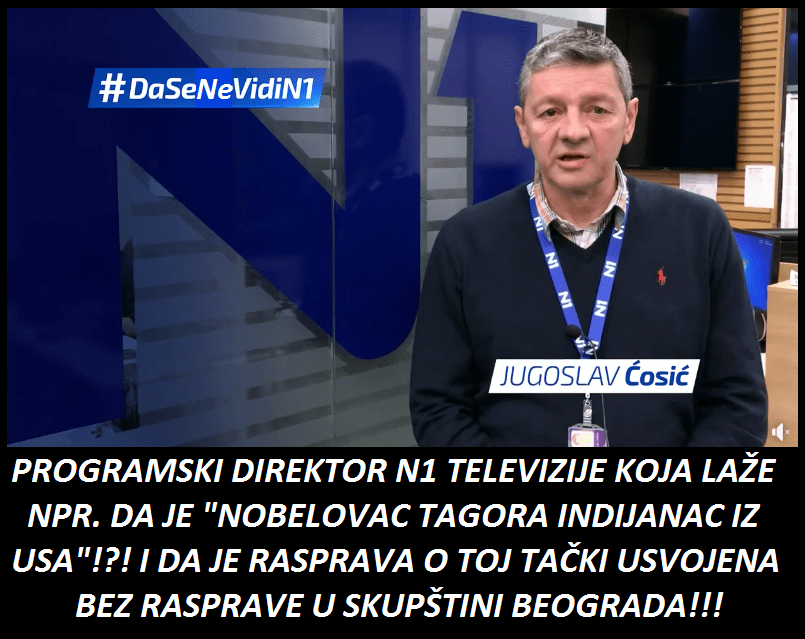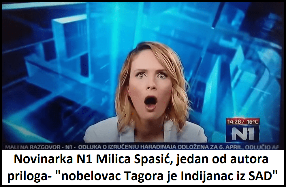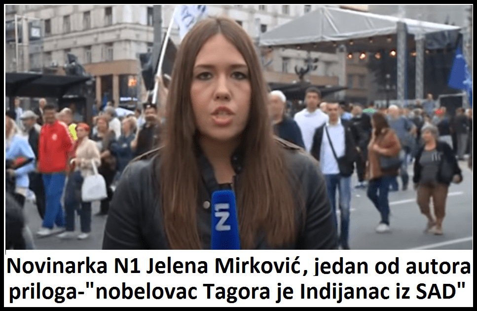 Ради се о запањујућем незнању новинарске „елите“ ТВ Н1. Као што видите у целом процесу, ни једно од пет, шест лица из „елитне“ ТВ Н1 – ради се о новинарима, уредницима, режији…, није ни чуло да постоји тамо неки Рабиндранат Тагоре, песник и нобеловац из Индије. Стога им није било чудно да се у Београду подиже споменик тамо неком „ИНДИЈАНЦУ“ песнику, уз то још и нобеловцу. Мислила је ТВ Н1 „елита“, „ма то оне будале крезуби сендвичари напредњаци опет подижу споменик некој будали“. Није им био чудан ни податак да је неки „Индијанац“ икада добио Нобелову награду за књижевност! А није. Јесу они америчка телевизија, али сматрају да нису обавезни да знају све америчке нобеловце!?! Нису се запитали ни како је тај „ИНДИЈАНАЦ“ записивао своје силне песме, нити ком племену је припадао? Чејенима, Апачима, Мохиканцима, Сијуксима? Наравно, „елита“ из ТВ Н1 не зна да до средине 20. века, практично није постојала писана књижевност северноамеричких староседелаца, већ само усмена. „Генијалцима“ из ТВ Н1 није било чудно ни то што се неки тамо „Индијанац“ зове Рабиндранат Тагоре, а не „Бик Који Седи“ или „Луди Коњ“ или „Онај који коцка на два улога“(Тајанданега), или „Тупи Нож“, или „Онај који зева“(Џеронимо), или „Мала Врана“, или „Црвени Облак“. „Генијалци“ са ТВ Н1 су чули за „Индијанца“ који се зове Гандра Лакшо, за кога знају да је власник њихове телевизије, а чије ратничко име је „Онај Малтежанин који игра голф“. Знају генијалци и за „Индијанца“ сувласника ТВ Н1 по имену Гандра Ласђи, који има чак два ратничка имена:„619 на 57 у 17“ и „Онај који бије Жену“. И генијалци са ТВ Н1 јесу чули и за Манитуа, Великог Духа, кога они зову Гандра. И коначно „елита“ са Н1 је чула за свог великог уредничког поглавицу по имену Гославју Сићћо, који такође има два ратна имена: „Жалосна Сова“ и „Онај који шљока“. Стога им није било чудно да се неки други „Индијанац“ зове Рабиндранат Тагоре.