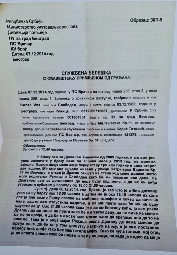 Исказ Иве Ђилас у МУП Врачар: „Драган је, као што је и био договор, узео нашу ћерку око 18 часова, а затим ме је око 18.10 из кола, док је још возио нашу ћерку, позвао на мобилни телефон и почео да виче на мене зашто сам отпустила дадиљу и да ми прети да ће ми на суду одузети децу. Око 21 сат, кад је вратио ћеркицу кући, ја сам рекла Драгану да ми више не прети како ће ми одузети децу, да не виче на мене и да ме не вређа и да бисмо ми исто тако могли њега да вређамо, али то не чинимо. Мајка је рекла Драгану да нема смисла да вређа мене, да би он у том тренутку насрнуо на њу, а ја сам се поставила између њих како бих заштитила мајку. Када је отац видео да ме је Драган напао, пришао му је са леђа како би га одвојио од мене. Тада је Драган оборио мог оца и песницом му задао ударац у пределу главе, и то све пред нашом ћерком Аном. Наставили су да се рву по поду, ја и мајка покушавале смо да их раздвојимо, а онда сам истрчала на ходник зграде и позвонила код комшија како би нам помогли, али нико није отварао врата. (…) Психички ме је малтретирао, то јест вршио тортуру нада мном док сам била трудна, дете је рођено превремено и са срчаном маном, има озбиљну аритмију. Такође, да нагласим да је за време моје трудноће Драган био са другом женом и за време док сам била трудна и док ме је малтретирао била сам код својих родитеља, а ниједном ме није позвао да пита како сам. Пре месец дана ми је претио тако што ми је рекао: “Одрубићу ти главу”. Ја све ово нисам пријављивала, али сада сам након свега веома забринута за своју безбедност, као и безбедност родитеља и деце“.