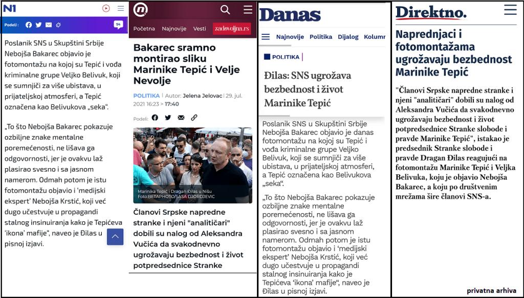 Наглашавам, десетодневна демонизација Вучића, Вулина и чланова њихових породица није проблем за већи део медија. То наводно није проблем, али је јуче изненада постала проблем једна фотографија са интернета, коју сам поделио на друштвеним мрежама. На тој фотографији су Вељко Беливук и Мариника Тепић, који се сликају за селфи.
