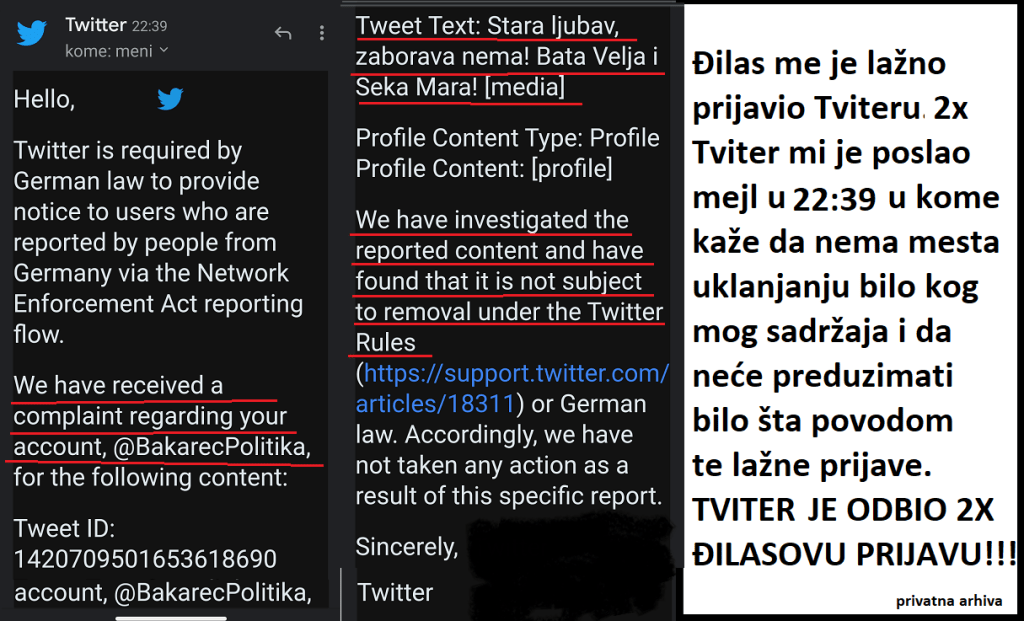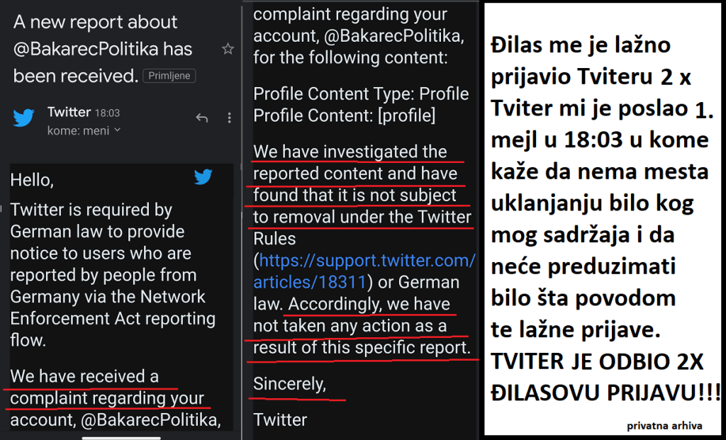 Ово је други мејл од Твитера: „We have received a complaint regarding your account, @BakarecPolitika, for the following content: Tweet ID: 142… Tweet Text: Stara ljubav, zaborava nema! Bata Velja i Seka Mara! We have investigated the reported content and have found that it is not subject to removal under the Twitter Rules) or German law. Accordingly, we have not taken any action as a result of this specific report. Sincerely, Twitter“ („Примили смо жалбу у вези вашег профила и садржаја „Стара љубав заборава нема! Бата Веља и Сека Мара!“. Испитали смо пријављени садржај и закључили да не подлеже уклањању по правилима Твитера. Сходно томе, нисмо предузели никакве радње по жалби против вашег садржаја. Искрено. Твитер“). То значи да је Твитер два пута одбацио Ђиласову пријаву против мог профила и против објављене фотографије Маринике и Беливука. То такође значи да ни администратори Твитера не виде ништа спорно у фотографији коју сам објавио, нити у било чему другом на мом профилу. А због чега је побеснео Ђилас? Побеснео је од немоћи да предузме било шта поводом објављене фотографије. Не постоји ништа противзаконито, неморално, непристојно у вези те фотографије. А у пратећем тексту нема псовања, нити ружних речи. И онда је Ђилас похистерисао и дао налог својим медијима да ме сатанизују. Обожавам када ме нападају политичко и медијско крило мафије! Похистерисали су и шеф Мафије Ђилас, и његова службеница Мариника, и ССП, и Н1, и Нова С и Директно. Одушевљен сам тиме колико много може да постигне једна фотографија Веље и Маринике објављена на мрежама! БИНГО! Пун погодак! И порука за Ђиласа – Свиђа ми се да ти не буде пријатно! Дисциплина кичме!