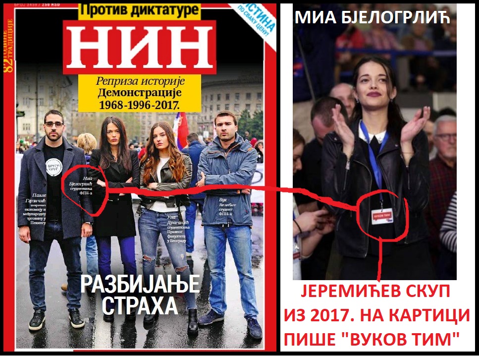 Ћерка Драгана Бјелогрлића, Миа Бјелогрлић (26) је данас глумица, али је 2017. док је имала 22 године студирала Факултет политичких наука, глумила студентског вођу, протеста које су организовали Саша Јанковић и Вук Јеремић, због тога што су поражени на председничким изборима. Миа Бјелогрлић ни на који начин није била вођа тих протеста, али је у њима учествовала. Као вођа студентских протеста, који уопште нису били студентски, представљена је због маркетиншких разлога, на насловници листа „НИН“, и у интервјуу том листу, који је водила Оља Бећковић. Миа Бјелогрлић је тада 2017., била члан Јеремићевог штаба. Појављивала се на свим његовим скуповима и око врата је носила картицу „ВУКОВ ТИМ“. Шта је било са њеним студирањем на ФПН, не зна се? Она је глумица.
