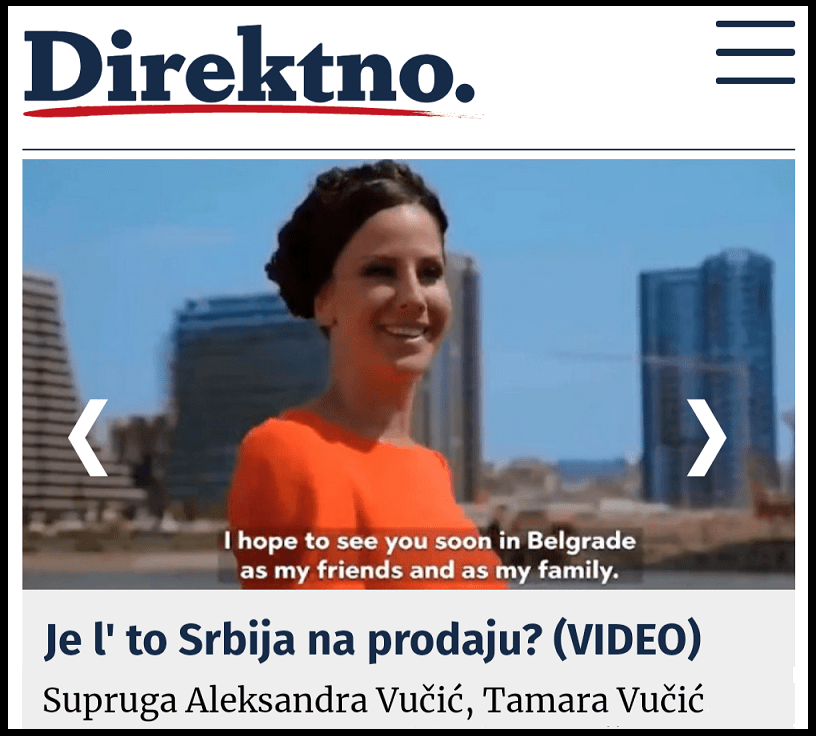 Ђилас и његови лешинари су госпођу Тамару Вучић оптужили да продаје Србију, ни мање ни вуше!?! Малоумни, непотписани прилог на Ђиласовом тоалетоиду „Директно“ гласи: „Је л’ то Србија на продају?“. У тексту хијене веле: „Супруга Александра Вучић, Тамара Вучић, у промотивном споту (…) полемише како је наша држава на продају (…) овај последњи спот изазвао је гнев дела јавности, јер се наша држава сервира као на длану. Уз то, за бригу је и шта прва дама изговара, али заиста“. Сам прилог је кратак, али је опремљен оптужујућим насловом – „Је л’ то Србија на продају?“, и принтскриновима госпође Тамаре Вучић и њеним промотивним спотом. Сваком нормалном медију би било јасно да ту нема било каквог места за оптужбе, и сатанизацију. Тако је Шолаков портал „нова.рс“ објавио потписани прилог о споту госпође Тамаре Вучић, али без бесмислених оптужби да „продаје Србију“. То је најбољи доказ колико је умоболан прилог на Ђиласовом порталу „Директно“. У складу са умоболним текстом су и претећи и увредљиви коментари портала „Директно“. Таргетирајући госпођу Тамару Вучић, Ђилас и његов портал, директно таргетирају и трогодишњег Вукана, сина Тамаре и Александра Вучића.