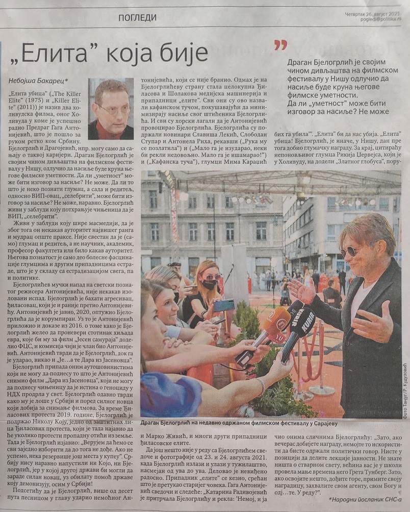 „Елита убица“ („The Killer Elite“(1975) и „Killer Elite“(2011)) је назив два холивудска филма, оног Холивуда у коме је успешно радио Предраг Гага Антонијевић, што је пошло за руком ретко ком Србину. Бјелогрлић и Драгојевић, нпр. могу само да сањају о таквој каријери. Драган Бјелогрлић је својим чином дивљаштва на филмском фестивалу у Нишу, одлучио да насиље и психоактивне супстанце буду круна његове филмске уметности. Да ли „уметност“ може бити изговор за насиље? Не може. Да ли то што је неко познати глумац, а сада и редитељ, односно ВИП-овац, „селебрити“, може бити изговор за насиље? Не може, наравно. Бјелогрлић живи у заблуди коју потхрањује чињеница да је ВИП, „селебрити“. Живи у заблуди коју шире масмедији, да је због тога он некакав ауторитет највишег ранга и мудрац опште праксе. Није свестан да је (само) глумац и редитељ, а не научник, академик, професор факултета или било какав ауторитет. Његова познатост је само део болесне фасцинације глумцима и другим припадницима естраде, што је у складу са естрадизацијом свега, па и политике.