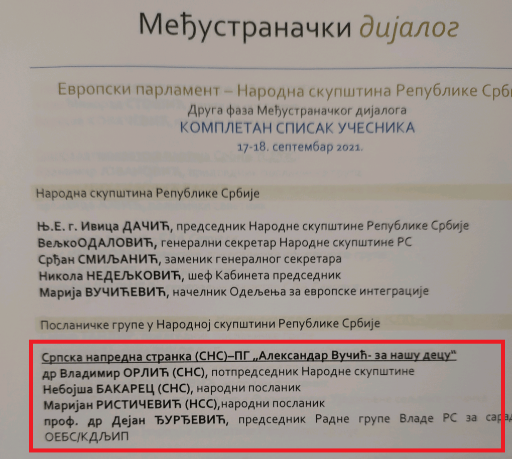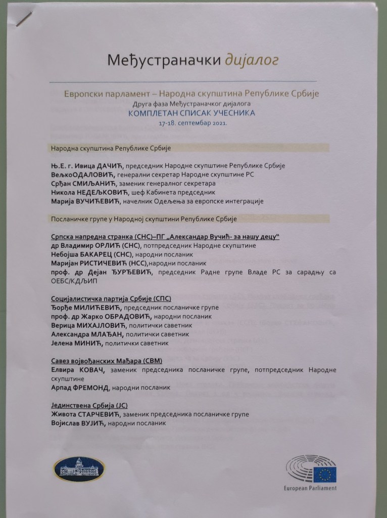 Српска напредна странка и председник Вучић, показују да још више желе да побољшају изборне услове, учешћем у Дијалогу 2021. Нажалост, групација странака око Драгана Ђиласа, и ССП, је опет показала да не жели дијалог и компромис. Ђилас и његови, су већ првог дана, побегли из Дијалога, као што су то учинили и 2019. на ФПН. Странка слободе и правде, Покрет за преокрет, Покрет слободних грађана и Демократска странка, без разлога и повода су одлучили да неће учествовати у наставку друге фазе међустраначког дијалога уз посредовање европарламентараца. Те 4 странке и групе грађана, иначе, заједно, имају до 6 одсто подршке грађана (рејтинг). Драган Ђилас рекао је да је документ који су понудили европарламентарци неприхватљив. Ђилас каже, после бекства из Дијалога: „Ово је све велика фарса, СНС све време говори да су овде идеални изборни услови, по њима је РТС Јавни сервис, опозиција има присуство какво би требало да има, нема притисака на људе (…) даље у овоме нећемо учествовати“. Са оваквим ставом није се сложио члан Ђиласове делегације, Небојша Зеленовић, председник странке Заједно за Србију, који није напустио Дијалог. Драган Ђилас овим смешним маневром себи прави алиби за нови бојкот избора. Ђилас је прекршио правила Дијалога, преносећи шта су други говорили, при чему је грубо слагао да га је извређао господин Владимир Орлић, шеф делегације СНС. Ђиласа нико није вређао. Господин Орлић је само тражио од Ђиласа да поднесе извештај члановима Европског парламента о стотинама милиона евра које је зарадио док је био на власти, путем медијских компанија, а медији су предмет Дијалога. Постоји око 70 сведока, који су учесници Дијалога, који могу да посведоче да никаквог вређања није било. Још важније, Ђилас је напуштањем Дијалога показао огромно непоштовање према многобројним учесницима, а посебно према представницима Европског парламента и Делегације ЕУ у Србији, који су били непријатно изненађени Ђиласовим примитивним поступцима.