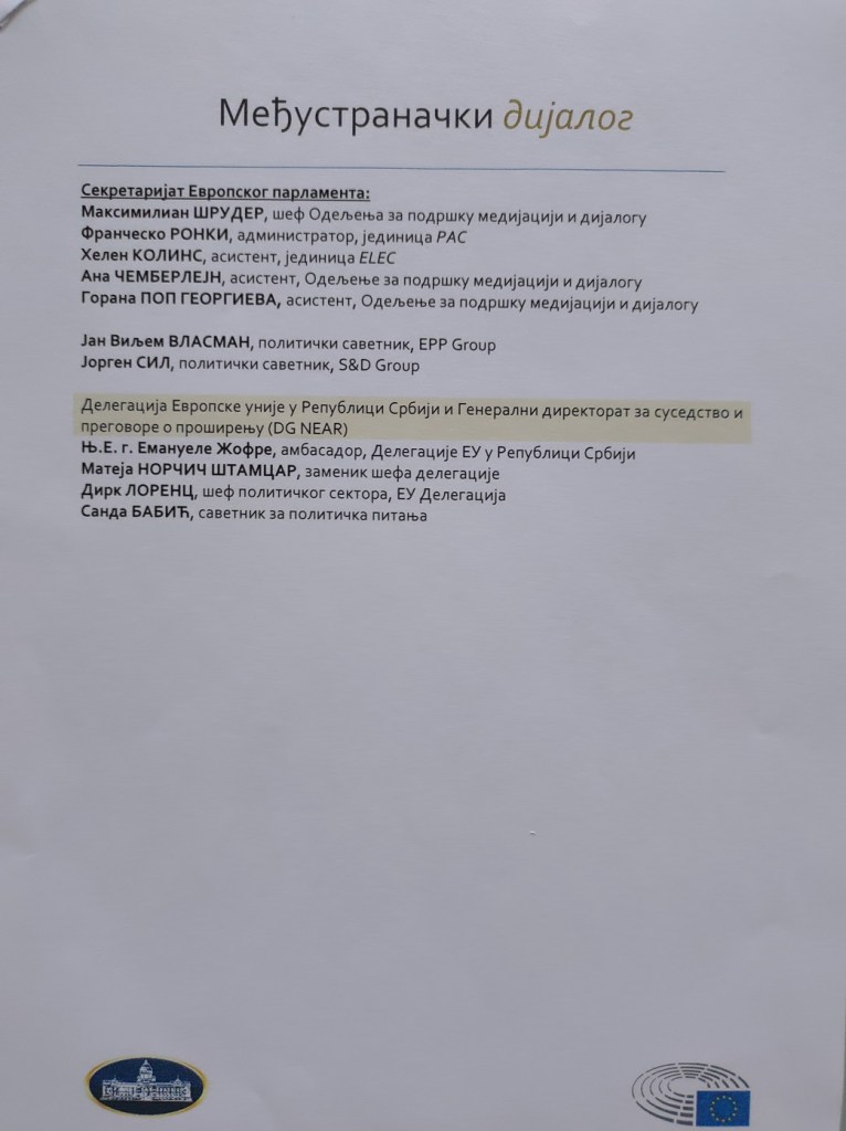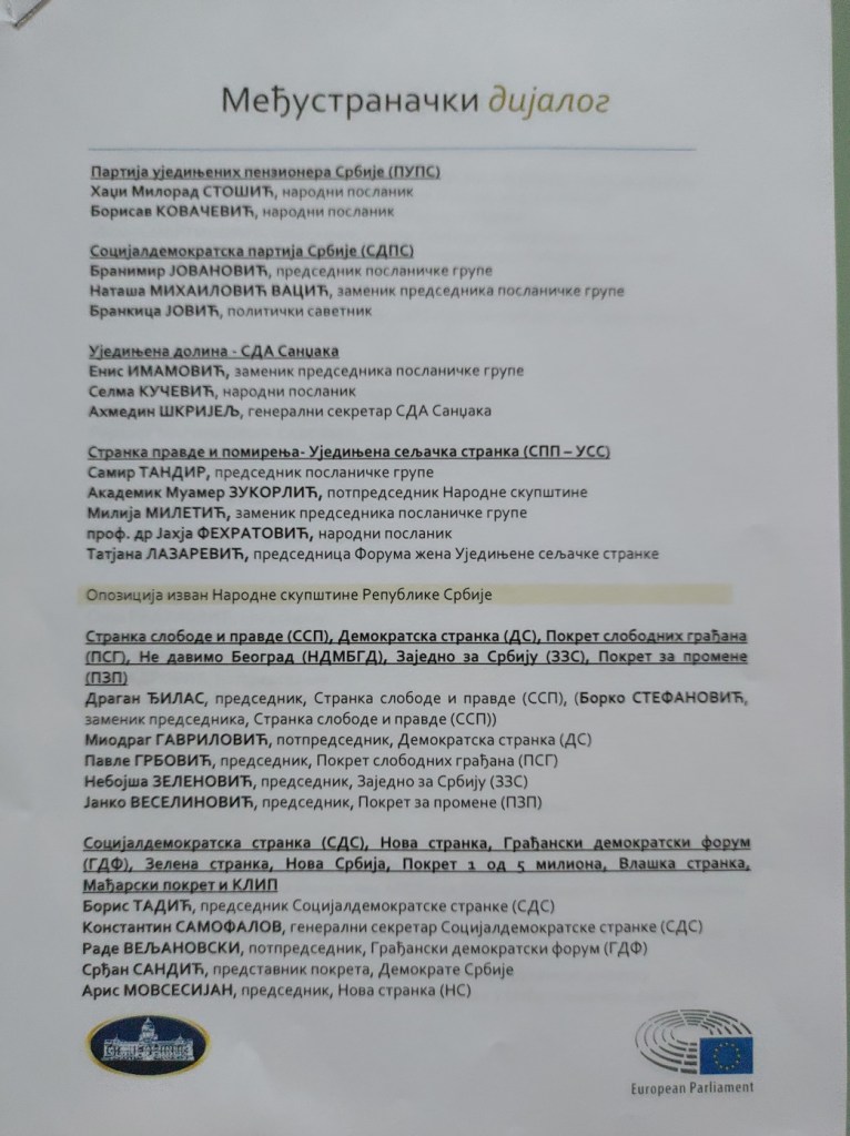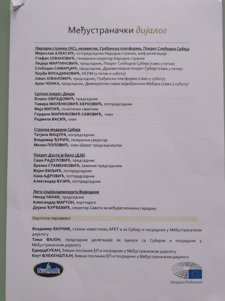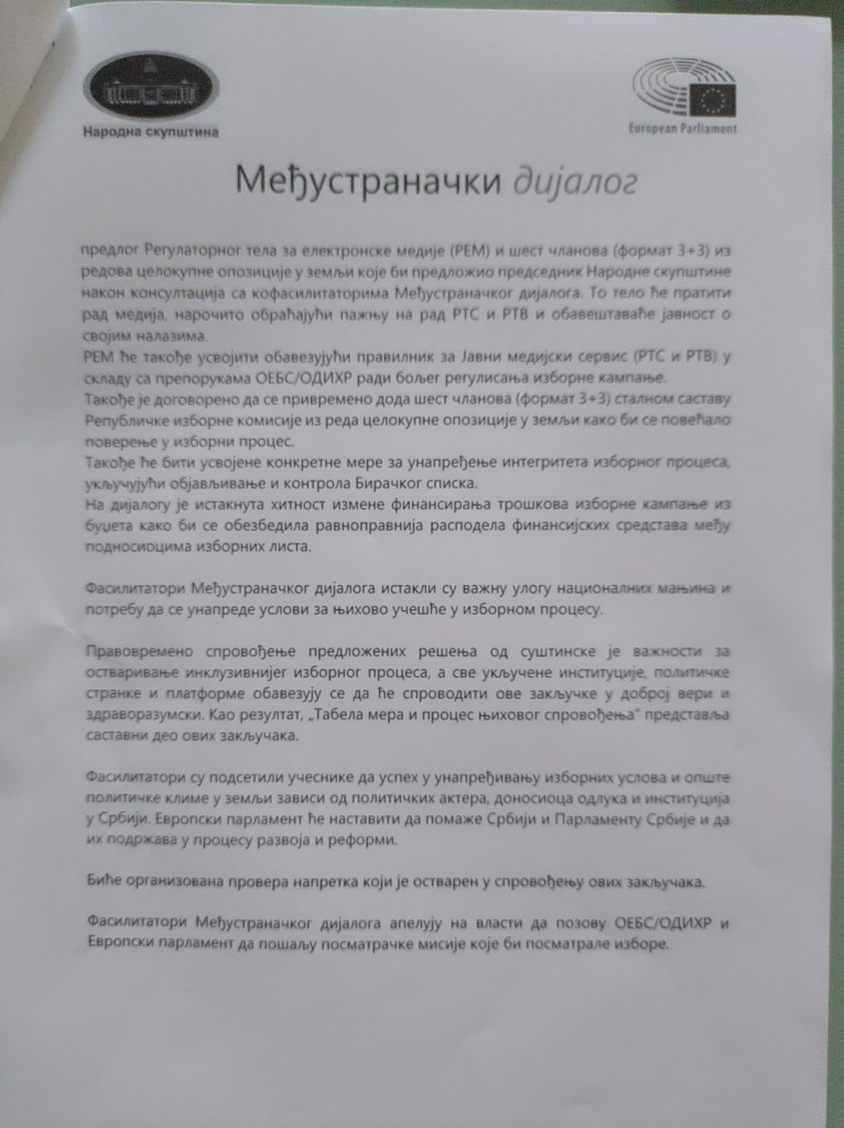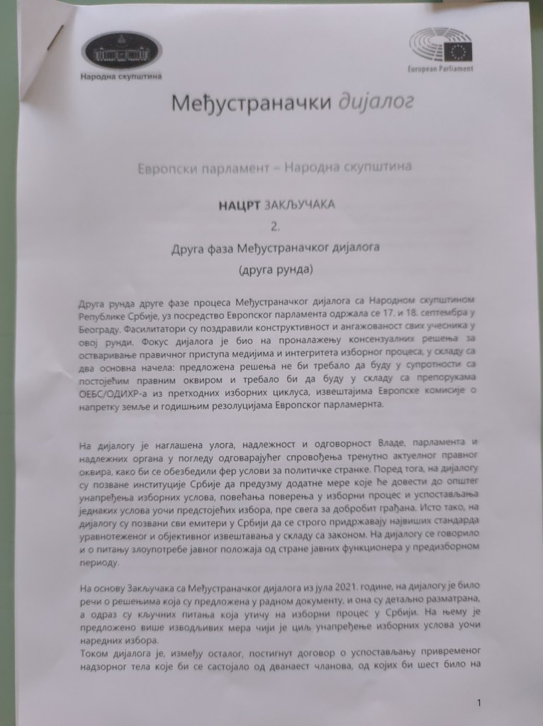 Сада ћу се опет вратити на Међустраначки дијалог. Другог дана Дијалога, завршена је друга фаза међустраначког дијалога о изборним условима, уз посредовање представника Европског парламента. Представници Европског парламента су заједно са председником Скупштине Србије, Ивицом Дачићем, представили своје предлоге „Мера за унапређење спровођења изборног процеса, договорене током процеса међустраначког дијалога уз посредовање Европског парламента“ и свој „Нацрт закључака“. Сви представници странака власти (СНС, СПС, ПУПС, СДПС, СВМ, ЈС), све странке мањина и поједине опозиционе странке (СМС, СДС, НОВА, ГДФ, ЛСВ) су прихватили предлоге представника ЕУ парламента и Ивице Дачића. Изразито против су биле Ђиласова и Јеремићева групација. Двери и ДЈБ су остали заглављени негде између прихватања и одбијања. Дакле, консензуса није било, како су прижељкивали представници парламента ЕУ.