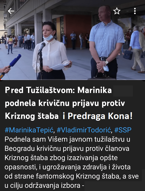 Да су мржња и неонацизам, који су уперени против др. Предрага Кона, итекако повезани са политиком, и постојећим странкама из опозиције, сведоче и следеће чињенице. Прикривена антиваксерка Мариника Тепић је 30.06.2020. у име Ђиласове странке ССП, поднела кривичне пријаве против чланова Кризног штаба, и поименце против Предрага Кона. Више пута је претила Предрагу Кону, Кризном штабу и вређала његове чланове. Као и Ђилас, противила се свим мерама лекара и епидемиолога. Као и Ђилас, противила се набавци руских и кинеских вакцина, тражећи само западне вакцине. После су се она и Ђилас ушуњали на вакцинацију, преко реда, и примили руску вакцину. Као и сви антиваксери она је Кризни штаб назвала „приватним штабом Александра Вучића и његове клике, параван који је направљен за ову страшну превару грађана“. А Мариника себе претставља као „антифашисткињу“ и неоправдано оптужује српски народ за геноцид у Сребреници!