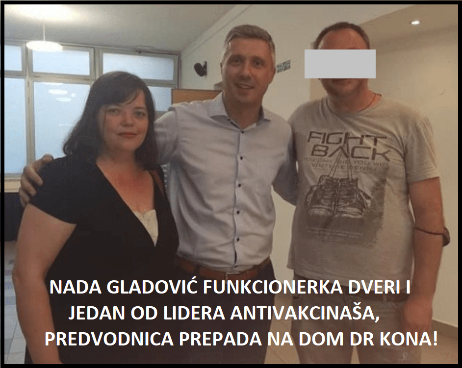 Предводница препада на дом др. Предрага Кона, 25. октобра, је Нада Гладовић, функционерка „Двери“. Она је особа која је урлала у мегафон, испред зграде др. Предрага Кона. Двери су отворено антиваксерска странка, уз ДЈБ, и надају се да ће на изборима 2022. покупити антиваксерске гласове. Нада Гладовић је радила у Министарству културе, у доба министра Владана Вукосављевића. Тамо је дошла по препоруци (то показује какав је министар био Вукосављевић). Нада Гладовић је била у радном односу у Министарству културе и информисања од 20. фебруара 2019. до 4. децембра 2019. године. У том периоду била на радном месту административно-техничког секретара у Кабинету министра Владана Вукосављевића. Решењем од 4. децембра 2019. године именованој је престао радни однос због злоупотребе права из радног односа – она је службени имејл користила за продају робе.