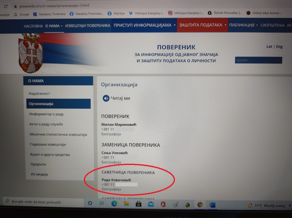 У служби Повереника имате барем 50 запослених ђиласоваца, „жутих“ или особа под утицајем Шабића (од укупно 100 запослених). Као што рекох, једна од особа које су отишле у „контролу“ винотеке у којој ради Данило Вучић је била Емина Ковачевић. Емина Ковачевић ради у канцеларији Повереника, на месту вишег саветника у Сектору за надзор, у Одсеку за надзор над заштитом података. Њена мајка Рада Ковачевић је саветница Повереника, тако да је Рада Ковачевић један од четворо водећих људи институције Повереника, што је скандал. Није ли то сукоб интереса? Чланови исте породице раде у истом надзорном телу, и ти чланови породице су били чланови или функционери ДС и СДС. То је доказ онога о чему сам говорио, да је велики број запослених у канцеларији Повереника, страначки обојен, и пристрасан. „Жути“ су у надзорним телима запослили, мноштво својих кадрова и чланова, не само у време своје власти, већ и до краја мандата Шабића (крај 2018.) или до краја мандата Саше Јанковића (фебруар 2017.).