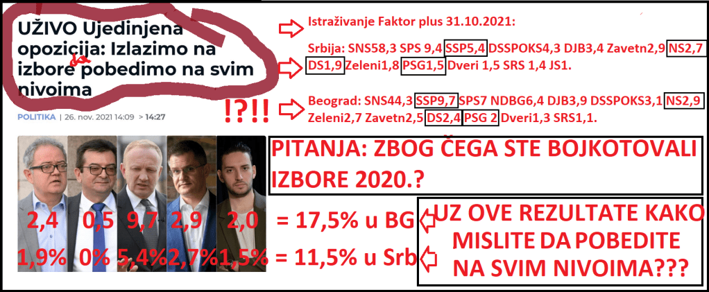 Drugo. Formalno, sporazum o koaliciji su potpisali: Stranka slobode i pravde, Narodna stranka, Demokratska stranka, Pokret slobodnih građana, Pokret slobodna Srbija, Pokret za preokret, Građanska platforma, Demokratska zajednica vojvođanskih Mađara i Udruženi sindikati Sloga. Od svih ovih 9 patuljastih ikebana stranaka i grupa građana, samo 4 stranke imaju rejting koji mere agencije za istraživanja javnog mnjenja, a to su SSP, NS, DS i PSG. Svi ostali – imaju potpuno beznačajan rejting. Po poslednjem istraživanju agencije Faktor plus od 31.102021. rejting stranaka na nivou Srbije je: SNS-58,3%; SPS-9,4; SSP-5,4; DSSPOKS-4,3; DJB-3,4; Zavetnici-2,9; NS-2,7:Ž; DS-1,9; Zeleni-1,8; PSG-1,5; Dveri-1,5; SRS-1,4; i JS-1. Na nivou Beograda rejting stranaka je: SNS–44,3%; SSP9,7; SPS-7; NDBG-6,4; DJB-3,9; DSS POKS-3,1; NS-2,9; Zeleni-2,7; Zavetnici-2,5; DS-2,4; PSG-2; Dveri-1,3; SRS-1,1. Kao što vidite četiri najbitnije stranke đilasovske koalicije u Srbiji imaju 11,5%, a u Beogradu 17,5%. Dodajmo ovoj koaliciji na konto ostalih 5 minijaturnih grupa građana, 1,5 odsto i vidimo da đilasovska koalicija ima oko 13 odsto na nivou Srbije, a oko 19 odsto na nivou Beograda. Kada to znamo, a to potvrđuju i istraživanja agencije „Ipsos“, onda se nameće pitanje ovim strankama: Uz ove rejtinge, ove gafove, uz ova podmetanja jednih drugima – kako mislite da pobedite na svim nivoima? Kada se vide rejtinzi ovih 8 strančica (i jednog nereprezentativnog sindikata) vidi se da se radi o patuljcima s naslovnih strana! Ovih 9 patuljaka su džinovi samo u đilasovskim medijima. U stvarnosti oni su patuljci. Patuljaste ikebana stranke. To sasvim liči na onu bajku o „Snežani i sedam patuljaka“ (i zloj vili Grdani). U našoj stvarnosti ova bajka se zove „Đilas i sedam patuljaka“ (i sindikat za silovanje). Još jednom da ponovim, rejtinzi ovih 9 činilaca koalicije su na nivou Srbije: SSP-5,4%; NS-2,7:Ž; DS-1,9; PSG-1,5; Pokret slobodna Srbija-0,3; Pokret za preokret 0,3; Građanska platforma-0,3; Demokratska zajednica vojvođanskih Mađara-0,3; i Udruženi sindikati Sloga-0,3. Ukupno 13 odsto.