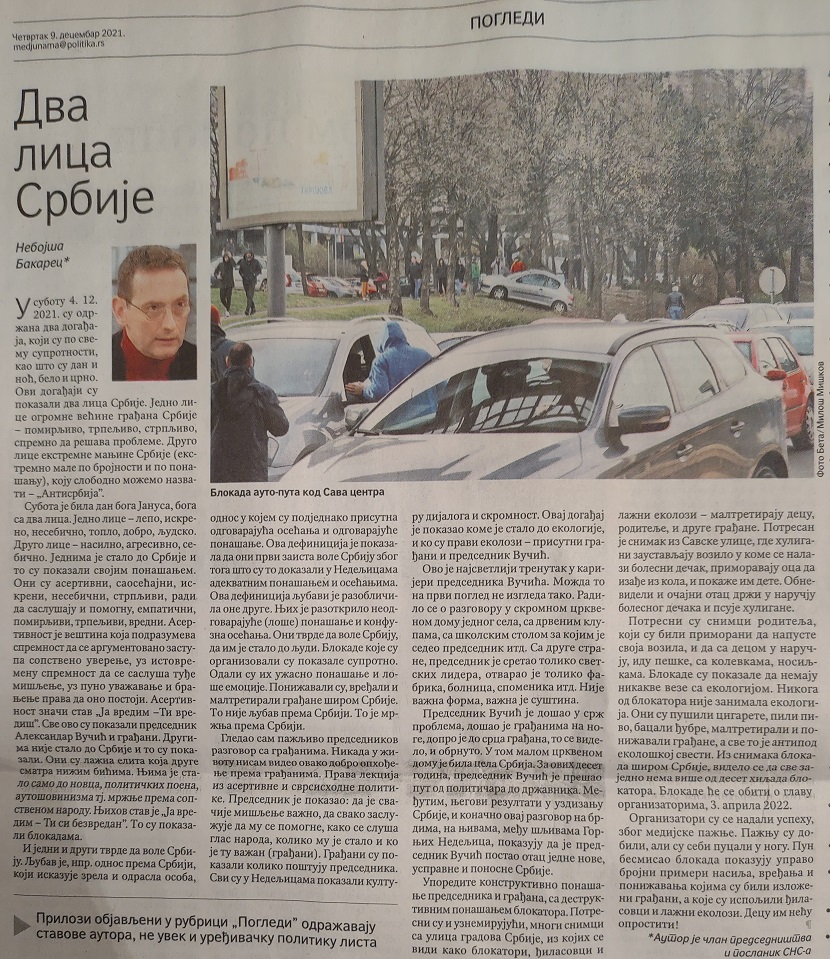 U subotu 4.12.2021. su održana dva događaja, koji su po svemu suprotnosti, kao što su dan i noć, belo i crno, dobro i zlo. Ovi događaji su pokazali dva lica Srbije. Jedno lice ogromne većine građana Srbije – pomirljivo, trpeljivo, strpljivo, spremno da rešava probleme. Drugo lice ekstremne manjine Srbije (ekstremno male po brojnosti i po ponašanju), koju slobodno možemo nazvati – Antisrbija. Subota je bila dan boga Janusa, boga sa dva lica. Jedno lice – lepo, iskreno, nesebično, toplo, dobro, ljudsko. Drugo lice – ružno, nasilno, agresivno, sebično, zlo, neljudsko. Jednima je stalo do Srbije i to su pokazali svojim ponašanjem. Oni su asertivni, saosećajni, iskreni, nesebični, strpljivi, radi da saslušaju i pomognu, empatični, pomirljivi, trpeljivi, vredni. Asertivnost je veština koja podrazumeva spremnost da se argumentovano zastupa sopstveno uverenje, uz istovremenu spremnost da se sasluša tuđe mišljenje, uz puno uvažavanje i branjenje prava da ono postoji. Asertivnost znači stav-„Ja vredim – Ti vrediš“. Sve ovo su pokazali predsednik Aleksandar Vučić i građani. Drugima nije stalo do Srbije i to su pokazali. Oni su narcisoidni egoisti koji vole da ponižavaju druge, lažna elita koja druge smatra nižim bićima. Njima je stalo samo do novca, političkih poena, autošovinizma- tj. mržnje prema sopstvenom narodu. Oni su bezosećajni, agresivni, nasilni, neiskreni, sebični, netrpeljivi. Njihov stav je „Ja vredim-Ti si bezvredan“. To su pokazali blokadama.
