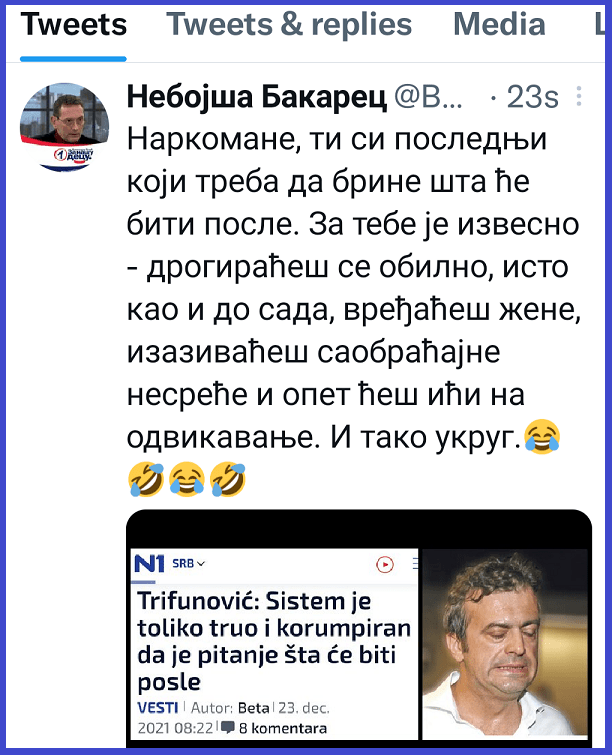 Бодар и чио после десетог одвикавања и рехабилитације, бивши председник ПСГ Сергеј Трифуновић је одлучио да заблиста у ђиласовским медијима, који су радо пренели његову нову халуцинацију: „Систем је толико труо и корумпиран да је питање шта ће бити после“. Чини се да је ПСГ наркоман последњи који треба да брине шта ће бити после. За њега је извесно дрогираће се обилно, исто као и до сада, вређаће жене, изазиваће саобраћајне несреће и опет ће ићи на одвикавање. И тако укруг.