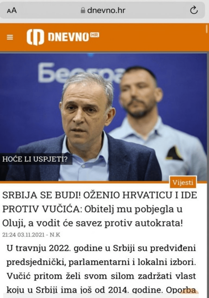 Od kada Đilas u svojim medijima gura Ponoša kao kandidata za predsednika, na Ponoševu sramotu, on dobija podršku za kandidaturu iz Hrvatske. Hrvatski mediji su se tokom novembra 2021. utrkivali u podršci Ponošu. Tako hrvatski portal „Dnevno“ objavljuje tekst pod naslovom -„Oženio je Hrvaticu, Srbija se konačno budi!“, kao deo kampanje da dovedu svog Ponoša za predsednika Srbije. Tako i hrvatski „Jutarnji list“ (ali i drugi hrvatski mediji) slavi Đilasovog Zdravka Ponoša. „Jutarnji list“ je objavio tekst pod naslovom „Oporbeni adut protiv Vučića: General oženjen Hrvaticom“. Tu kažu da je Ponoš zaljubljen u Zagreb i opisuju Ponoševu ljubav prema Zagrebu. Zdravko Ponoš je rođen u Hrvatskoj i poseduje urednu domovnicu. Ranije, pre devedesetih, Ponoš je voleo da kaže da ima dve domovine – Hrvatsku i SFRJ! Kada znamo sve ovo, možemo sa razlogom da upitamo Zdravka Ponoša zbog čega se ne kandiduje za predsednika Hrvatske, kada ima ovoliku podršku hrvatskih medija i same Hrvatske?