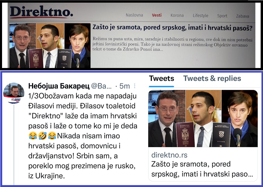 Po Đikijevom nalogu, njegov toaletoid „Direktno“ je počeo da širi šovinističku mržnu i laži. Danas 28.01.2022. su lansirali tekst u kome tvrde da je sramota imati, pored srpskog i hrvatski pasoš. I još pitaju, i daju odgovor zbog čega je to tako. U ovom tekstu „Direktno“ je šovinistički napao premijerku Brnabić, ministra Vanju Udovičića i mene. Tako đilasovski toaletoid kaže i laže: „Nebojši Bakarecu smeta što je Ponoš rođen u Kninu i kaže da je kandidat Hrvatske, a sam Bakarec je rođen u Osijeku, te je njegova budalaština još besmislenija. Pritom, u javnosti se spekuliše da je Bakarecov deda bio izvesni Eugen Bakarec, ustaški natporučnik, o čemu su pisali mediji. Takođe, kako Ani Brnabić ne smeta što se toliko napadaju Hrvati, kada je njen deda po ocu Hrvat? Za Vanju Udovičića već znamo da može da prećuti kada mu se prebaci zbog toga što ima hrvatsko poreklo, jer mu je Vučić već jednom prebacio kako „nije Srbin“. Ali i Vanja ima hrvatsko pored srpskog državljanstva, pa se nije čulo kako nekome to smeta, te je ministar u Vladi Srbije“. Čist šovinizam đilasovskog toaletoida.