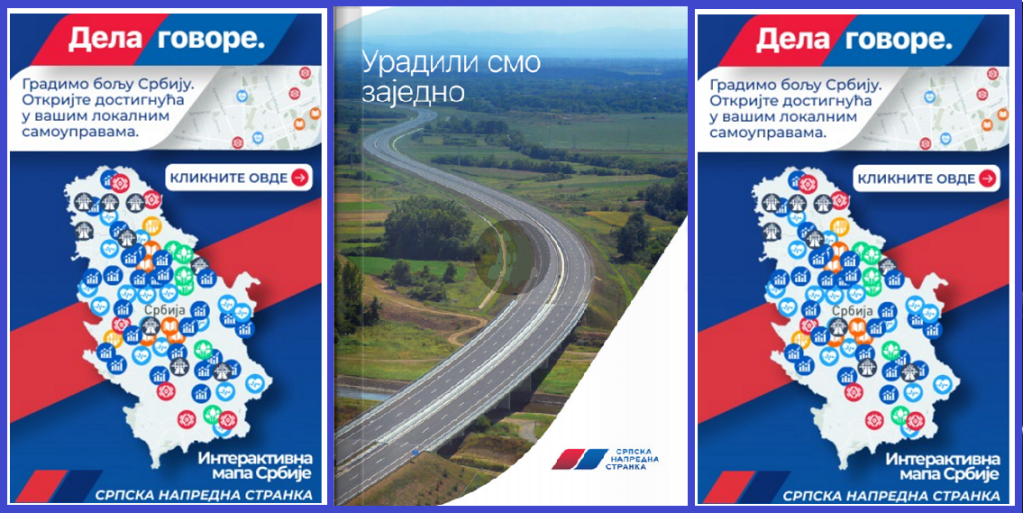 Sa druge strane Srpska napredna stranka je upravo objavila fantastičan sajt „Dela govore“ na kome se nalaze i Interaktivna mapa Srbije, na kojoj se vidi šta je postignuto u prethodnom periodu, i fenomenalna brošura „Uradili smo zajedno“ u kojoj su predstavljeni rezultati u uzdizanju, gradnji i napretku Srbije. SNS je usvajanjem seta izbornih zakona, na zahtev opozicije, koji još više poboljšavaju odlične izborne uslove, opoziciji ponudio najprimamljivije i najpoštenije izborne uslove u Evropi. Predsednik Vučić je otišao u posetu Kini, gde je najavio još bolju saradnju sa Kinom, i potpisivanje izvanrednog Ugovora o slobodnoj trgovini sa Kinom, koji će predstavljati ogromnu šansu za privredu Srbije!