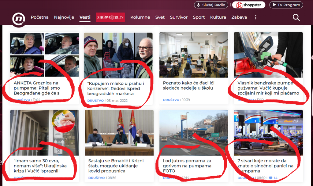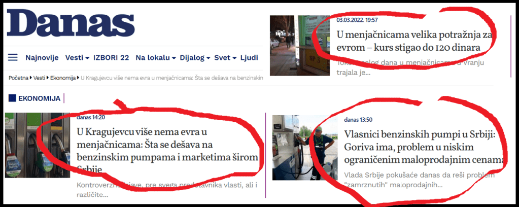 Najbolji primer je današnja (04.03.2022.), vest u rubrici „Ekonomija“, lista „“Danas, pod naslovom: „U Kragujevcu više nema evra u menjačnicama: Šta se dešava na benzinskim pumpama i marketima širom Srbije?“. Autor teksta je: „Ekipa Danasa“. Neimanovana ekipa „Danasa“ piše: „Kontroverzne izjave, pre svega predstavnika vlasti, ali i različite informacije po društvenim mrežama o posledicama ukrajinske krize, izazvale su različite reakcije. Nemali broj građana je posegnuo za stvaranjem zaliha…“. Potom se u tekstu stvara utisak, pre svega glavnim naslovom i podnaslovima, da su nestašice opšta pojava i taj utisak pojačava navođenje imena desetak gradova gde navodno vladaju nestašice. Tekst je veoma dugačak i u njemu, između ostalog stoji: „KRAGUJEVAC: Nema evra u menjačnicama. Evro je od jutros „skočio” u Kragujevcu i ne može da se nađe ispod 120 a negde „ide” i do 121 dinara kao kupovna cena. Ali, nema ga po menjačnicama. (…) nestanak evra izazvao „interesovanje” za druge devize kakvo odavno nije viđeno pa Kragujevčanu kupuju dolare i švajcarske franke. (…) u pojedinim radnjama već je registrovana „pojačana nabavka”: ulja, brašna i šećera. Ipak, kao kada je svaka kriza u pitanju, pa i ova očekujemo da se u jednom trenutku javi kod ljudi „nagomilavanje” lekova (…) ZAJEČAR: U Zaječaru je na pojedinim pumpama bilo gužve, koje su se nastavile i danas. Zaječarca koga smo zatekli na jednu od pumpi kazao je za Danas, da je pošao da sipa gorivo pošto je sinoć dobio informacije od prijatelja da će gorivo poskupeti i da će biti nestašice. Što se marketa tiče, ima većih gužvi (…) Najviše se kupuje zejtin i brašno, kao i konzerve ribe i paštete. SUBOTICA: Nakon što je sinoć došlo do stvaranja redova automobila na pojedinim subotičkim pumpama, danas je situacija nešto mirnija. ŠABAC: Na OMV pumpi u Šapcu kažu da su sinoć i danas u jutarnjim satima, zabeležene veće gužve i povećana prodaja za oko 30 odsto. Gužva je zableležena i na NIS-ovim pumpama. Posebno su zabrinuti poljoprivrednici kojima je gorivo potrebno zbog prolećne setve i koji žele da obezbede rezerve. NOVI PAZAR: U Novom Pazaru je sve bilo mirno, do pre nekoliko dana kada se zbog informacija ili dezinformacija iz medija digla panika, pa su građani masovno počeli da kupuju namirnice i gorivo. Jedna od građanki juče je prokomentarisala da su gužve u radnjama ogromne i da se do sat vremena čeka na kasi, a da ljudi većinom kupuju osnovne životne namirnice poput brašna, šećera, mleka i mlečnih proizvoda. Takođe je rekla da su svi artikli poskupeli. Gužve su ogromne i ljudi čak pune dodatne kanistre da imaju u rezervi“.