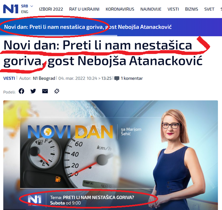 Ovih dana, kao deo specijalnog, hibridnog rata protiv Srbije, koji vodi deo zapadnih struktura, se plasiraju lažne vesti o nastašicama goriva, deviza i životnih namirnica u Srbiji. Time se širi panika među građanima Srbije. Radio televizija Srbije, i drugi mediji za to optužuju „društvene mreže“. Lako je i bezopasno, i delimično netačno, optužiti bezlične „društvene mreže“. Mnogo je tačnije i jednostavnije reći šta je izvor lažnih vesti na društvenim mrežama. Izvor su Šolakovi i đilasovski mediji – TV „Nova S“, list „NOVA“, list „Danas“, TV „N1“, njihovi sajtovi i sajt „Direktno“ itd. Oni su pravi izvor tih lažnih vesti. Oni vode specijalni, hibridni rat protiv Srbije, plasirajući te lažne vesti. Među njima ima razlika. U širenju navedenih lažnih vesti prednjače TV „NOVA S“, list „NOVA“ i njihov sajt, kao što možete videti iz printskrinova vesti ove medijske kuće. Za „NOVOM“, sledi list „Danas“ i njegov sajt. Ovu vrstu lažnih vesti, znatno manje su širili sajtovi TV „N1“ i „Direktno“.
