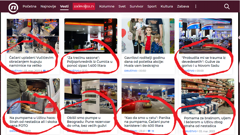 „UŽICE: U trgovinskim lancima povećana je potražnja za osnovnim životnim namirnicama, pa u nekima od njih nije bilo svih vrsta pšeničnog brašna (…) Građani u trgovinama kupuju veće količine brašna, šećera, ulja, soli, dererdženta za pranje odeće i drugih sredstava za higijenu. U pojednim većim trgovinskim lancima nema svih vrsta pšeničnog brašna, poput tipa – 400, kao i šećera, ali tih namirnica ima u drugim trgovinama. Na benzinskim stanicama je povećana prodaja goriva, ali gužve nisu tako velike kao što su bile sinoć. NIŠ: Kupuje se brašno, ali i alkohol (…) Od početka ukrajinske krize, a posebno u poslednjih nekoliko dana, građani masovnije kupuju osnovne životne namirnice, posebno brašno, ulje, šećer i so, rekli su za Danas u trgovinskim lancima Idea i As. Na tri nasumično izabrane benzinske pumpe u Nišu kazali su da “ima pojačane gužve”, ali da ima i goriva. Jedan od prodavaca je rekao da su “sinoć dolazili i žitelji okolnih sela koji su punili kanistere”, a da pojedini građani rezervoare pune “do čepa u rezervoaru”. U dve apoteke u niškom naselju Durlan kazali su da građani kupuju lekove više nego ranije. ZRENJANIN: Najviše se nabavljaju hrana i lekovi. (…) Zrenjaninci prave zalihe. Najviše se nabavljaju hrana i lekovi, ko može kupuje gorivo, a devize kome pretekne. Benzinska pumpa u Melencima, kako saznajemo, nema euro dizela. Primetno je i neraspoloženje i nervoza kod građana. Niko ne zna šta može da se desi, kažu u jednoj ovdašnjoj menjačnici i potvrđuju da je veliko interesovanje za devize“.