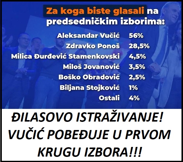Da li namerno ili slučajno Đilas je u prikazu istraživanja predsedničkih izbora, priznao da njegov kandidat za predsednika Srbije, Zdravko Ponoš, gubi izbore već u prvom krugu! Đilas je u tabeli objavio da će Vučić u prvom krugu pobediti i osvojiti 56%, a Ponoš samo 28,5%. Naravno, ni ovi podaci nisu sasvim tačni zbog toga što će Vučić osvojiti više od 56%, a Ponoš znatno manje od 28,5%. Međutim, bitno je da čak i lažov Đilas, priznaje da će Vučić pobediti u prvom krugu predsedničkih izbora! Kao što se Đilas otreznio 4. marta 2018. godine, kada je do nogu poražan u Beogradu, tako će Đilas doživeti bolno otrežnjenje 3. aprila oko 21 čas. Istina najviše boli.