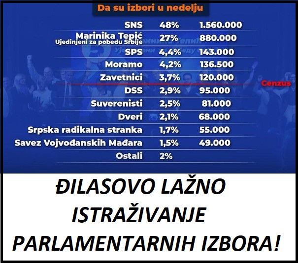 Prvo moram da objasnim da Đilas tvrdi da je njegova koalicija zajedno sa „Moramo“, jača od koalicija SNS i koalicije SPS- zajedno. Đilas i njegova koalicija imaju bolji rejting u Beogradu, nego u ostatku Srbije, to je tačno. Kao što vidimo iz istraživanja NSPM, u Beogradu je koalicija SNS za 25% jača od Đilasove (45,6%:20,7%)! Po istraživanju NSPM, Đilas i „Moramo“ zajedno imaju 29,8%, a SNS i SPS zajedno imaju 55,4%! Vidimo prvu Đilasovu veliku neistinu – da su on i „Moramo“ jači od SNS i SPS. Nisu, mnogo su slabiji – slabiji su za velikih 25,6%. Druga još veća Đilasova neistina, sada, posle prikaza istraživanja NSPM, postaje jasna. Rejting Đilasove parlamentarne liste ne može biti veći od rejtinga Đilasove beogradske liste, jer Đilas u Srbiji stoji znatno lošije nego u Beogradu. Đilas je u svom lažnom istraživanju objavio da je rejting njegove liste u Srbiji 27%!?! A NSPM je prilično tačno, objavio da je rejting Đilasove liste u Beogradu 20,7%! Iz toga je jasno da je Đilas lažirao istraživanje, i da je rejting svoje liste u Srbiji, prikazao dvostruko većim od stvarnog. Dakle, rejting Đilasove parlamentarne liste se kreće oko 13-14%, a gradske liste u Beogradu oko 19-21%. To potvrđuju i rezultati beogradskih izbora 2018. kada je, praktično istovetna, Đilasova lista osvojila 18,95%, a lista SNS-45%! Ovim što su objavili, NSPM i Vukadinović su ubili u pojam Đilasa, i razvejali sve njegove laži o pobedi u Beogradu. Ovim što su NSPM i Vukadinović objavili, dokazali su koliko je lažno „istraživanje“ koje je Đilas objavio 10.3.2022.!