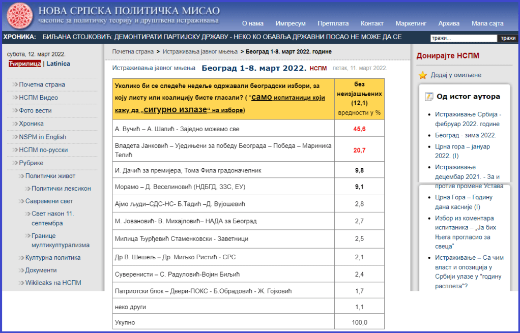 Sada dolazimo do teme i naslova ovog teksta. Ukoliko neko ne veruje istraživanjima agencije „Faktor plus“, mora da veruje istraživačima NSPM, koji su opoziciono naklonjeni, dugi niz godina. Do pre pola godine Vukadinović i NSPM, su zajednički sa Đilasom radili i objavljivali „istraživanja“. U međuvremenu, nešto je među njima puklo. Istraživački tim NSPM, koji predvodi Đorđe Vukadinović, je dan posle Đilasa, 11.03.2022. objavio istraživanje javnog mnjenja, obavljeno u Beogradu od 1-8. marta 2022. NSPM kaže da je istraživanje bilo telefonsko, reprezentativni uzorak, a da je ispitanika bilo 900. Naglašavam, radi se o istraživanju u Beogradu, koje se ticalo gradskih lista. Ovi rezultati potpuno gase sve Đilasove nade o pobedi u Beogradu, o kojoj on toliko govori. Takođe, ovo istraživanje NSPM je pokazalo koliko su lažna dva „istraživanja“ koja je Đilas objavio – parlamentarno i predsedničko.