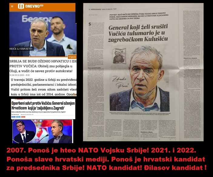 Zdravko Ponoš je kandidat NATO i Hrvatske za predsednika Srbije. Ponoš nije branio, ni Knin, ni RSK, dok drugi oficiri rodom odatle, jesu. Zdravko Ponoš je bio žuti načelnik Generalštaba, u doba Borisa Tadića. Smenjen je i oteran iz vojne službe, zbog toga što je, čak i za ukus Šutanovca i Tadića, isuviše otvoreno radio za interese SAD i NATO. Službe su zabeležile Ponoševo obećanje američkom senatoru (2006.) da će sastav vojske smanjiti sa 62.000 na 27.000 ljudi, da će zatvoriti brojne kasarne i da će se potruditi da promeni način razmišljanja u našim oružanim snagama, a posebno kod oficirskog kadra. Sukob sa Ponošem je otišao tako daleko da je godinu dana posle smenjivanja Ponoša, Tadić doneo ukaz o prestanku profesionalne vojne službe Zdravka Ponoša. Američke diplomate su u depešama, koje je objavio Vikiliks, obelodanile da u srcu reforme sistema odbrane u Srbiji imaju Ponoša, čoveka koji ima stav i orijentaciju koja je u skladu sa američkim interesima. Depeše Vikiliksa, tj. depeše iz ambasade SAD u Beogradu, su o Ponošu rekle: „26.5.2006. Broj depeše: 06BELGRADE842 — U srcu reforme sistema odbrane u Srbiji imamo Zdravka Ponoša, čoveka ima stav i orijentaciju koja je u skladu sa američkim interesima“; i još: „2.6.2016. Broj depeše: 06BELGRADE880 – Američki senator Džim Inhof posle posete Srbiji konstatovao da je Ponoš nedvosmisleno opredeljen za ulazak srpskih oružanih snaga u NATO. Kao najvažnije, Ponoš je rekao da promena stanja svesti oružanih snaga, a naročito oficira, predstavlja najveći izazov“.