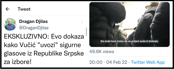 Ova laž đilasovaca o fiktivno prijavljenim građanima je bila samo uvod u drugu, sličnu laž koju su đilasovci lansirali par dana kasnije. Tako je Đilas lično lansirao tu novu neistinu 04. februara 2022., prvo putem svojih društvenih mreža, a potom putem svojih medija. On je okačio video snimak, i uz taj snimak je napisao tekst: „EKSKLUZIVNO: Evo dokaza kako Vučić „uvozi“ sigurne glasove iz Republike Srpske za izbore!“. Kada se pogleda snimak, vidi se da tu nema ničega spornog. Sporno je to što se na snimku čuje komentatorka koja izgovara neistine o krađi izbora koja se mavodno sprema, koja vređa građane koji se vide na snimcima. Snimak je opremljen i titlom, koji takođe predstavlja čiste laži o krađi izbora. Ceo snimak, i sam Đilas sugerišu kako Vučić sprema krađu izbora tako što fiktivno, u Beogradu prijavljuje građane Republike Srpske. Trik na snimku, predstavlja činjenica da građani Republike Srpske imaju puno pravo na državljanstvo Srbije i da oni, već decenijama, svake godine, odlaze najviše u nadležni MUP u Beogradu da ostvare to svoje pravo. U ovoj kampanji im je to pravo više puta osporio Dragan Đilas.
