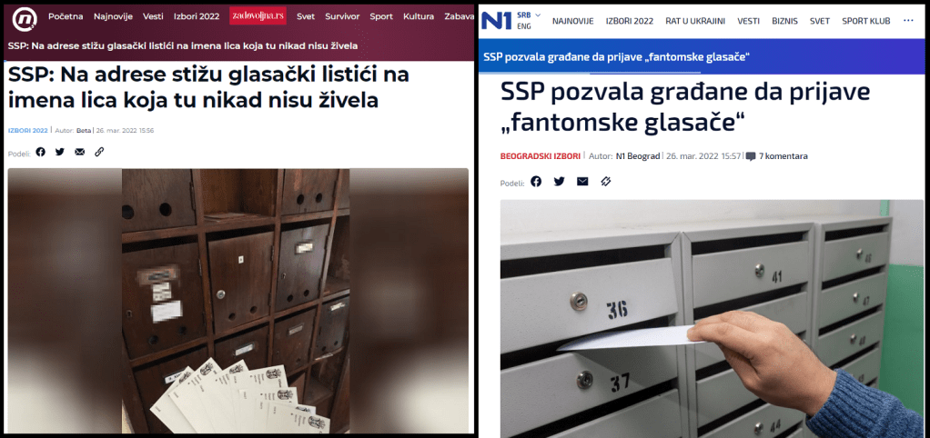 U očajničkom saopštenju stoji: „Beogradski odbor SSP upozorio je danas na pojavu „fantomskih stanara“ uoči izbora 3. aprila i pozvao građane i predsednike skupština stanara da takve slučajeve prijave. SSP je prethodnih dana dobio pozive uznemirenih građana da na njihove adrese stižu glasački listići na imena lica koja nikada nisu živela kod njih u zgradi ili u njihovima kućama. Postoji rizik da se ‘uvoze’ ucenjeni građani u Beograd da bi glasali za SNS na predstojećim izborima, u Srbiji ili u dijaspori. Pozivamo građane i predsednike skupština stanara da proslede dopise o odjavi navedenih lica lokalnim policijskim stanicama i opštinama, sa molbom da provere da li je došlo do krivičnog dela zbog takve prijave“.