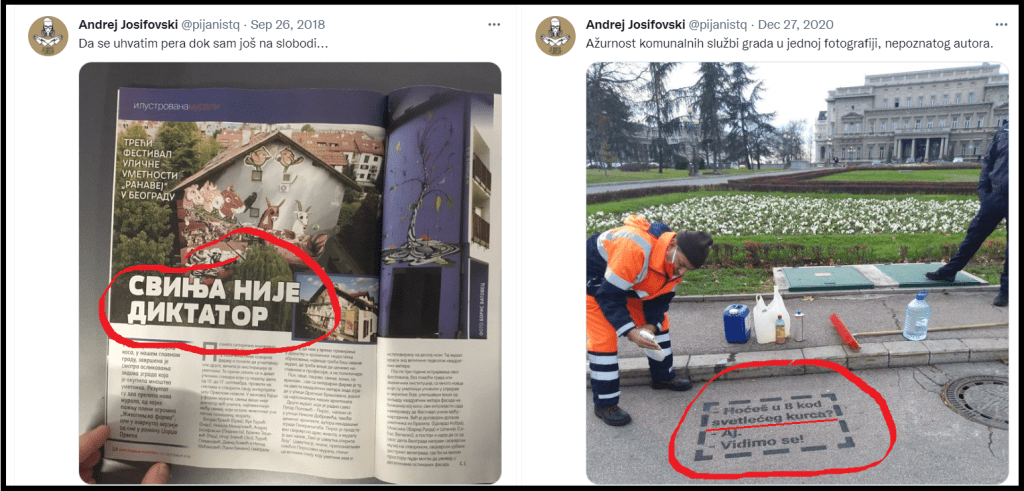 Iz svih medijskih nastupa Andreja Josifovskog se vidi da on prezire SNS, vlast i predsednika Vučića. Da mrzi predsednika Vučića, najjasnije je pokazao 21. i 22. avgusta 2014. godine, kada je vandalizovao jedan zid na Bežanijskoj kosi, na uglu ulica Nikole Dobrovića i Stojana Aralice, gde je namalao ogroman, izuzetno ružan mural, sa likom premijera Vučića, uz uvredljive natpise. Dakle, naružio je i izvređao Aleksandra Vučića još 2014.