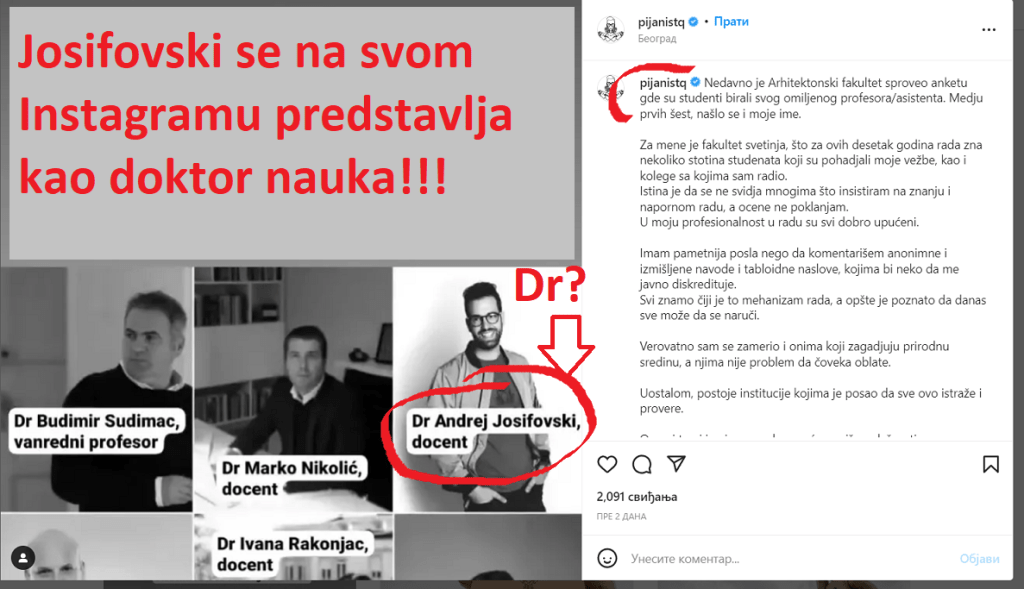Andrej Josifovski je arhitekta. Ima 32 godine. Na sajtu Arhitektonskog fakulteta stoji da je Josifovski docent i asistent je na Arhitektonskom fakultetu Univerziteta u Beogradu od aprila 2015. godine. Stoji da je završio master akademske studije na istom fakultetu, a da je trenutno student doktorskih akademskih studija. Sam Josifovski se na svom Instragramu predstavlja kao doktor nauka i docent. Teško je razaznati šta je istina. Da li je Josifovski master arhitekture ili je doktor arhitekture, teško je reći? I ova dilema je indikativna. Odgovor na ovu dilemu je jednostavan. Ili AF i Josifovski nisu ažurirali podatke, ili se Josifovski lažno predstavlja kao doktor nauka.