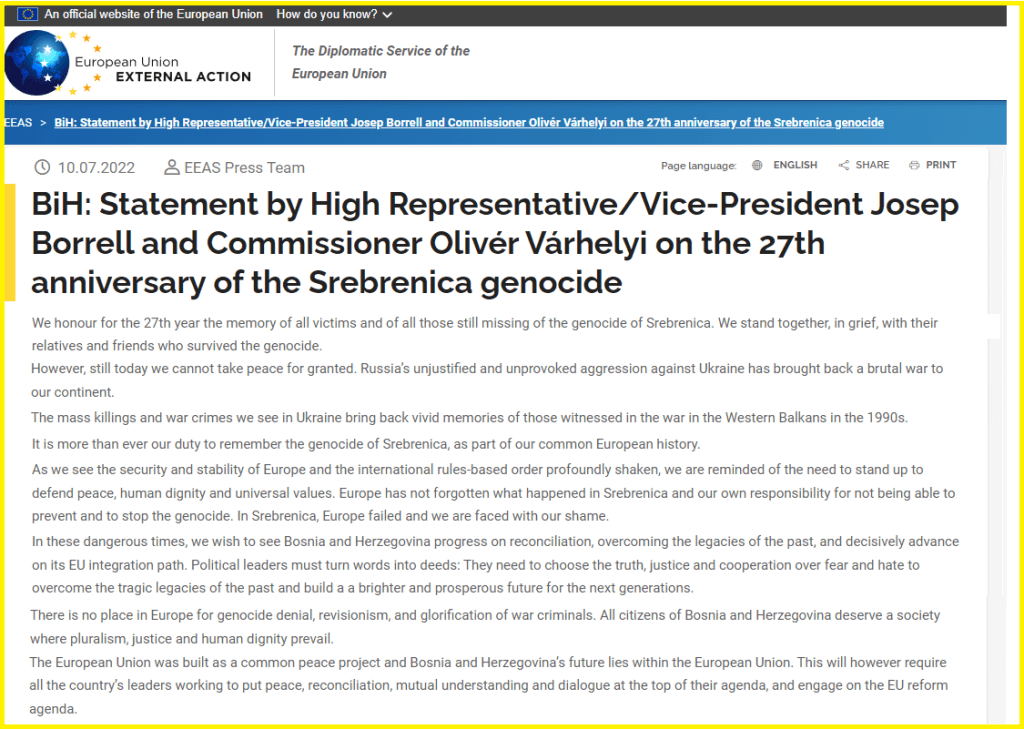 Šef diplomatije EU Žozef Borelj i evropski komesar za proširenje Oliver Varhelji, oglasili su se 10.7.2022. povodom 27. godišnjice zločina u Srebrenici. Paralelno sa citatima iz saopštenja EU, postaviću nekoliko pitanja predstavnicima EU.