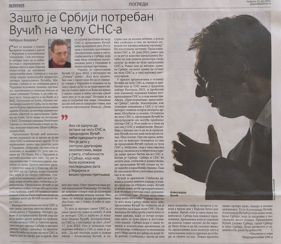 U prilog argumentima o ostanku Vučića na čelu SNS, govore i problemi koje je SNS imala u gradskom odboru Beograda 2021. i problemi koje izazivaju pojedini bivši potpredsednici SNS, a sada ministri. Afera „Prisluškivanje predsednika Srbije“, takođe. Malobrojni, ali uticajni pojedinci u SNS su svoj interes stavili ispred interesa države. Izgubili su kompas. Ostankom na čelu SNS, predsednik Vučić će preduprediti sve moguće probleme unutar SNS. I ne radi se o tome da smo mi u SNS infantilni. Nismo. Nije u pitanju ni to da li je predsednik Vučić postao naš svojevrsni talac. Nije postao. Pre ove krize, većina nas se nevoljno pomirila sa tim da predsednik Vučić odlazi sa čela SNS. Međutim, sada u ovoj užasnoj ratnoj, ekonomskoj i energetskoj krizi, više nismo bitni mi iz SNS. Bitna je Srbija. Srbija i SNS će ostati jake, stabilne i jedinstvene, ako predsednik Vučić ostane na čelu najveće i najmoćnije stranke. Tada će svi konci biti u njegovim rukama, kao i do sada.