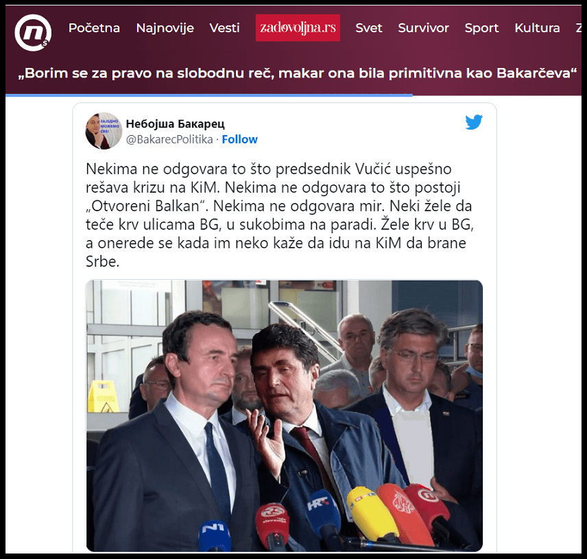 Narodna poslovica „ne pada sneg da pokrije breg, već da zveri pokažu tragove“ još jednom se pokazala na delu. Kada sam objavio fotografiju Aljbina Kurtija, Dragana Šolaka i Andreja Plenkovića, digla se i ala i vrana. Svi tajkunski mediji koji su me napali pokazali su šta im je važno, koga štite i za koga rade. Za Kurtija, Šolaka i Plenkovića. Priznajem da sam uživao. Obožavam kada me satanizuju tajkunski mediji! To je za mene velika čast! Ovi tajkunski mediji su mi obezbedili besplatnu reklamu, i dizali su mi rejting. Objavljivali su moje fotografije, objavili su fotografiju Kurtija, Šolaka i Plenkovića. Citirali su moj tekst. Ulepšali su mi dan! Tajkunski mediji su naravno slagali da sam tom fotografijom Kurtija, Šolaka i Plenkovića, targetirao novinare. Od kada su Kurti, Šolak i Plenković novinari? Ni jedan od te trojice nije novinar. Time su ovi tajkunski i antisrpski mediji objavili lažne vesti. Da su objavili naslove „Bakarec targetirao Kurtija, Šolaka i Plenkovića“ to bi bila već tačnija vest. Međutim naslovi tajkunskim medijima su bili:„Poslanik SNS ugrožava bezbednost novinara nezavisnih medija“ (Nova S), „Novinari nezavisnih medija na meti poslanika SNS: Serijom tekstova i foto-montaža ugrožava im bezbednost“ (Danas), „Poslanica DS traži razrešenje Bakareca zbog targetiranja novinara i medija“ (N1, Nova S),„Članska karta menja sve: Bakarec targetira novinare, a služi se i fotomontažom“ (N1), „Borim se za pravo na slobodnu reč, makar ona bila primitivna kao Bakarčeva“ (Danas, Nova S).