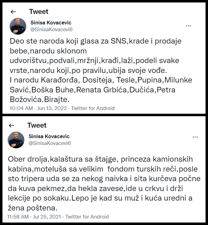 Što se tiče primitivizma, političke destruktivnosti i udvorištva koje mi prebacuje Kovačević, podsetiću da je profesor fakulteta, dr. Siniša Kovačević 25.7.2021. na svom Tviter nalogu objavio sledeće uvrede ženama, citiram Kovačevića: „Ober drolja,kalaštura sa štajge, princeza kamionskih kabina,moteluša sa velikim fondom turskih reči,posle sto tripera uda se za nekog naivka i sita kurčeva počne da kuva pekmez,da hekla zavese,ide u crkvu i drži lekcije po sokaku.Lepo je kad su muž i kuća uredni a žena poštena“. Da li profesor Kovačević ovim rečima uči svoje studente? Ovu njegovu paškvilu je osudila čak i opoziciona novinarka Jovana Gligorijević, urednica lista „Vreme“.