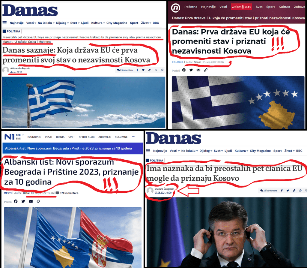 Odmah sutradan po predsednikovoj objavi, tajkunski, antisrpski mediji su ozlojeđeni podatkom koji je izneo predsednik Republike, udarili kontru, objavljivanjem spekulacija i lažnih vesti, o tome da će 5 država EU, koje ne priznaju Kosovo, uskoro priznati Kosovo. „Danas“ je 21.9.2022. objavio tekst pod naslovom: „Danas saznaje: Koja država EU će prva promeniti svoj stav o nezavisnosti Kosova“. „Nova S“ je 21.9.2022. objavila tekst pod naslovom „Danas: Prva država EU koja će promeniti stav i priznati nezavisnosti Kosova“ citirajući list „Danas“. Iz tih tekstova se vidi da se radi o spekulacijama, priželjkivanju tih medija da se to desi. Dalje, iz tih tekstova se vidi da nemaju kredibilan izvor za tu vest, već navode da citiraju „Albanijan post“ i kažu „navode naši izvori“. Ovi mediji već godinama objavljuju, u suštini lažne vesti o tome kako će pet država EU, koje ne priznaju Kosovo, to uskoro učiniti. I to se nije dogodilo. Sada se pozivaju na navodni plan Nemačke i Francuske u 13 tačaka, što je čista spekulacija. Tako je list „Danas“ 7.5.2021., dakle pre godinu i po, objavio sličan tekst autorke Snežane Čongradin, pod naslovom: „Ima naznaka da bi preostalih pet članica EU mogle da priznaju Kosovo“. I u tom tekstu se najavljuje da će 5 pomenutih država EU uskoro priznati Kosovo. Od objavljivanja tog teksta je prošlo godunu i po, i pokazalo se da je tekst čista laž. Tako je sa i mnogim drugim tekstovima na ovu temu, koje tajkunski mediji objavljuju godinama. U najnovijem slučaju „Novu S“ i „Danas“ odaje i tajming. Pre ova dva medija, teren je pripremila „N1“ koja je pre tri dana objavila tekst pod naslovom: „Albanski list: Novi sporazum Beograda i Prištine 2023, priznanje za 10 godina“. U tom tekstu se objavljuju čiste spekulacije već pomenutog albanskog „Albejnijan posta“, koji komentariše navodni plan Nemačke i Francuske. Tajkunski mediji su objavili tekstove pune laži iz čiste zlobe, da napakoste onima koje je obradovala najava predsednika Vučića! Nije li ih sramota da priželjkuju slabljenje svoje države Srbije, a jačanje lažne države Kosovo? Nije, znamo! Jad i beda tajkunskih medija.